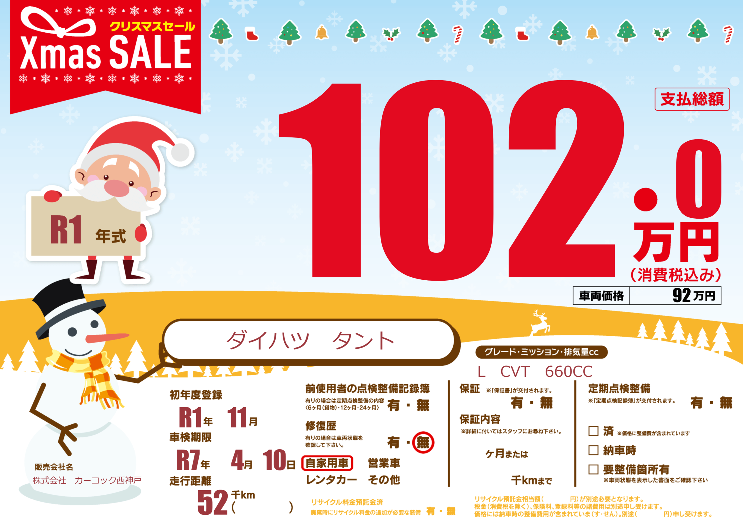 | 車名 | ダイハツ タント | グレード ミッション 排気量 |