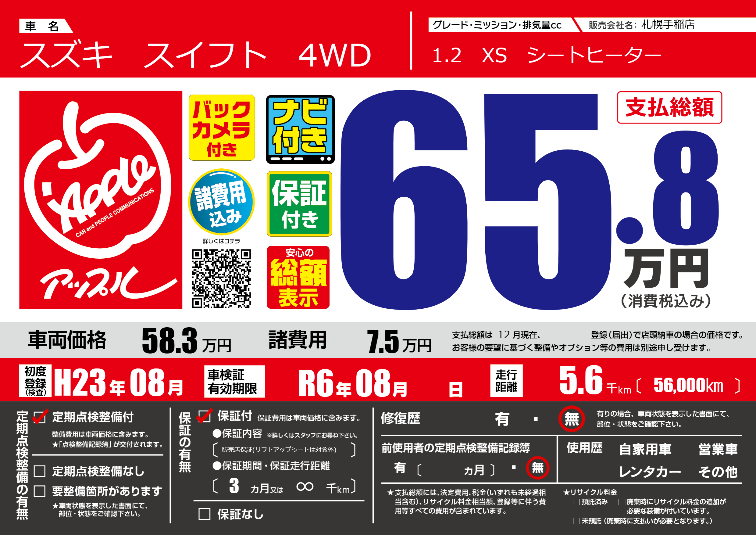 | 車名 | スズキ スイフト 4WD | グレード ミッション 排気量 |