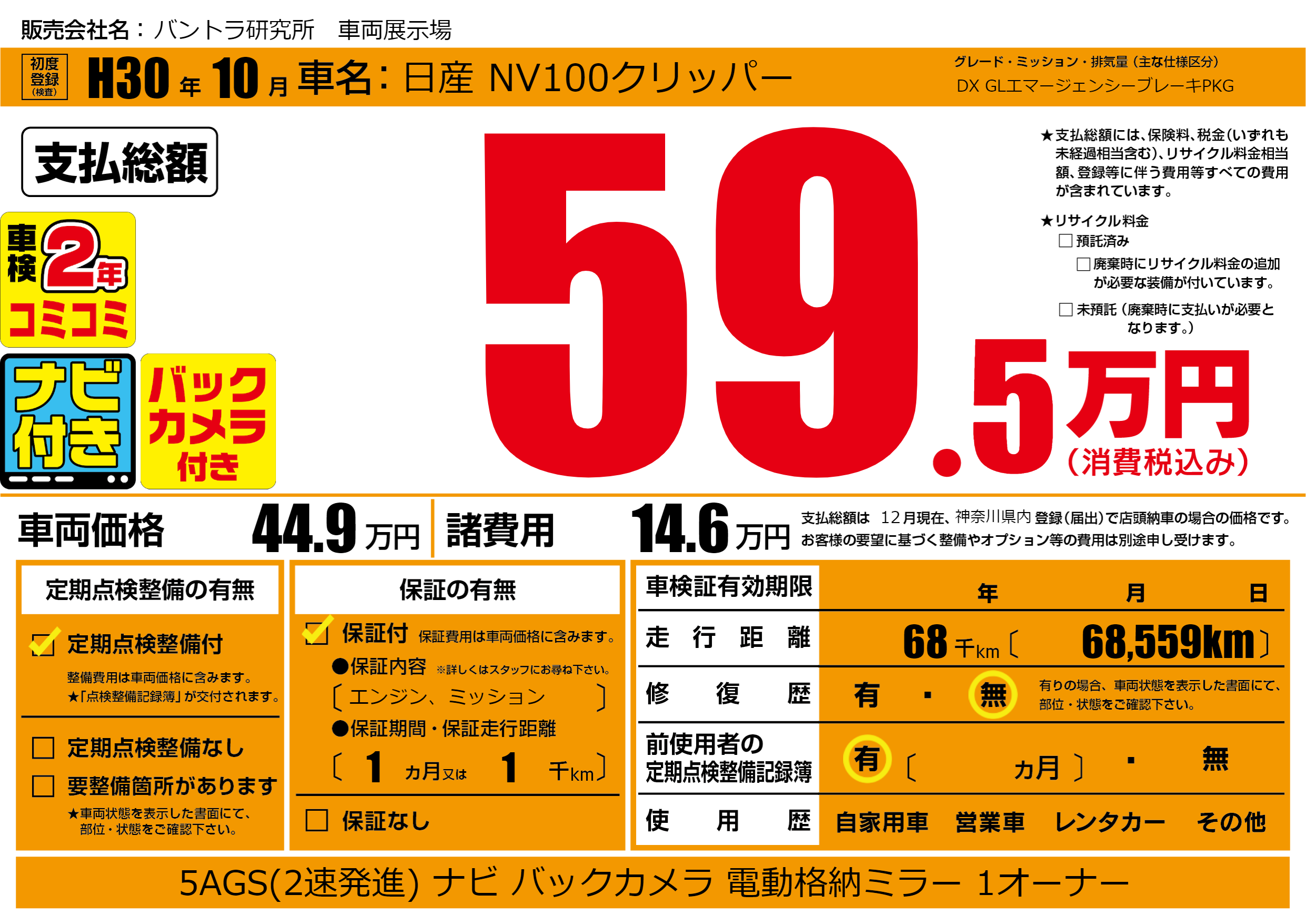 | 車名 | 日産 NV100クリッパー | グレード ミッション 排気量 |