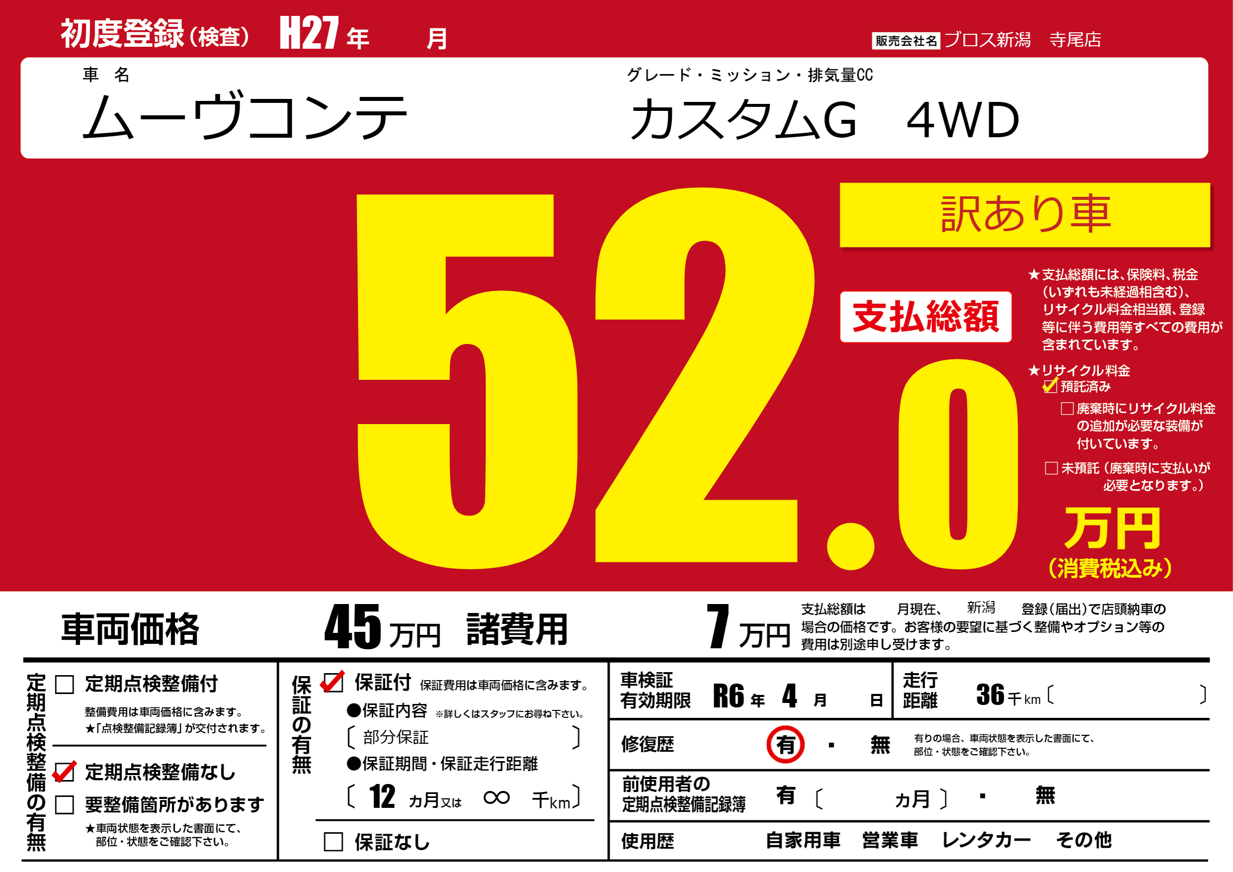 | 走行キロ | 3.6万km | 初年度登録 | H27年---月 |
