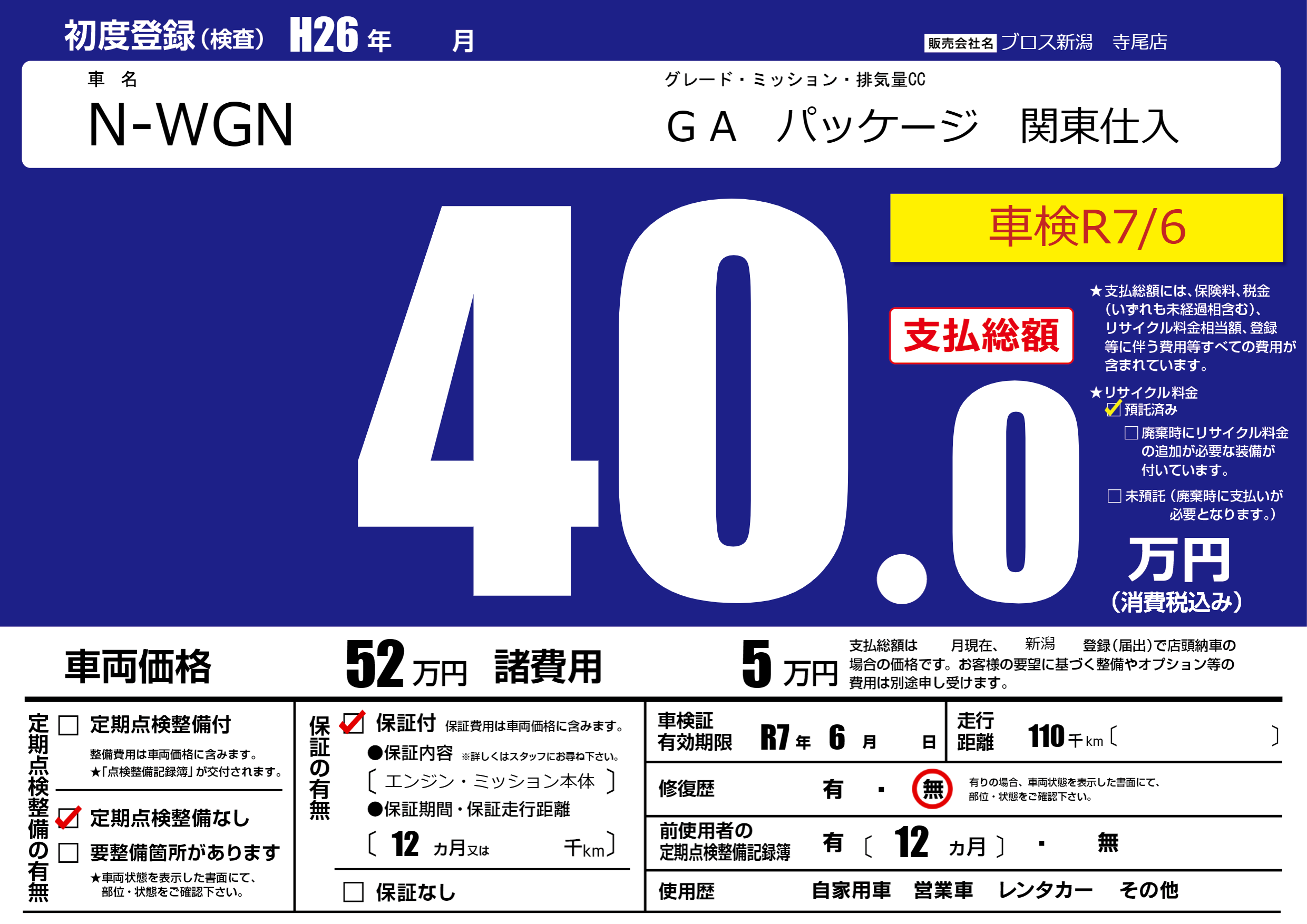 | 車名 | N-WGN | グレード ミッション 排気量 |