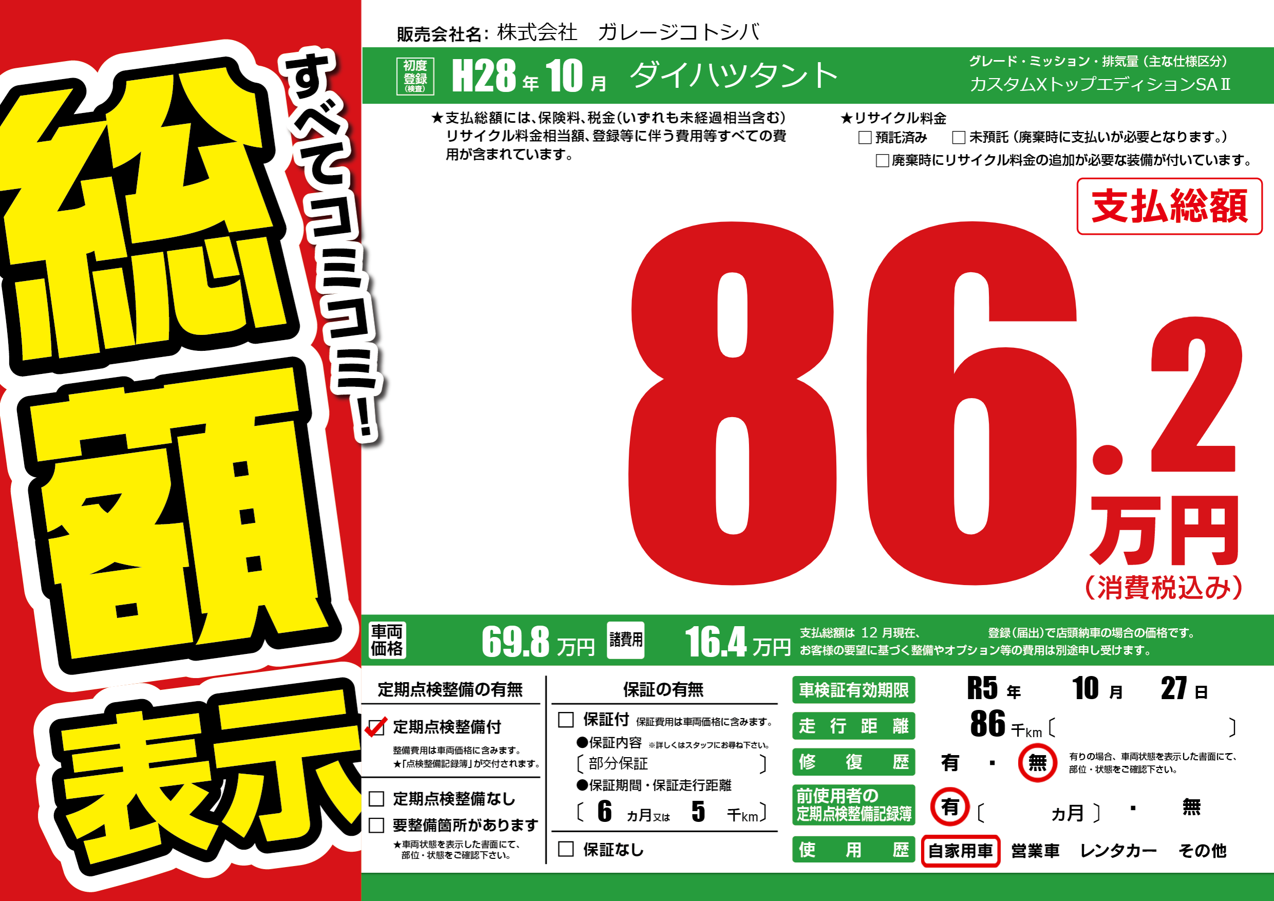 | 走行キロ | 8.6万km | 初年度登録 | H28年10月 |