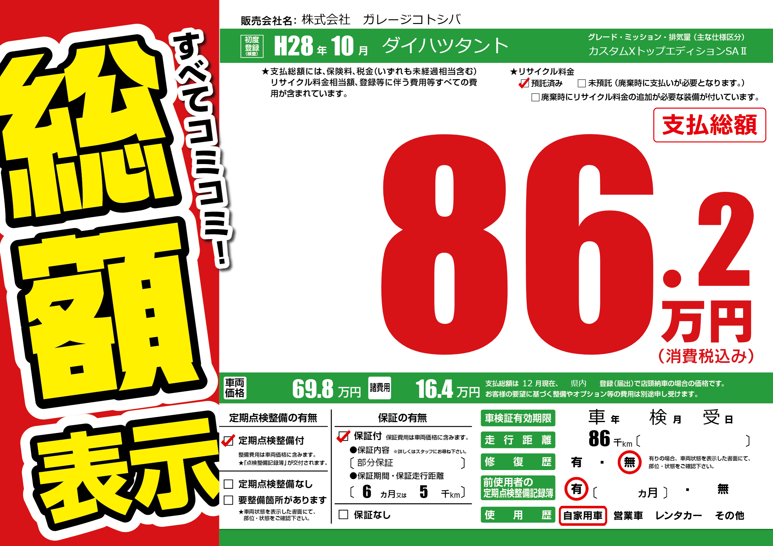 保証付き 保証内容(部分保証) 6ヶ月または(5)千kmまで |