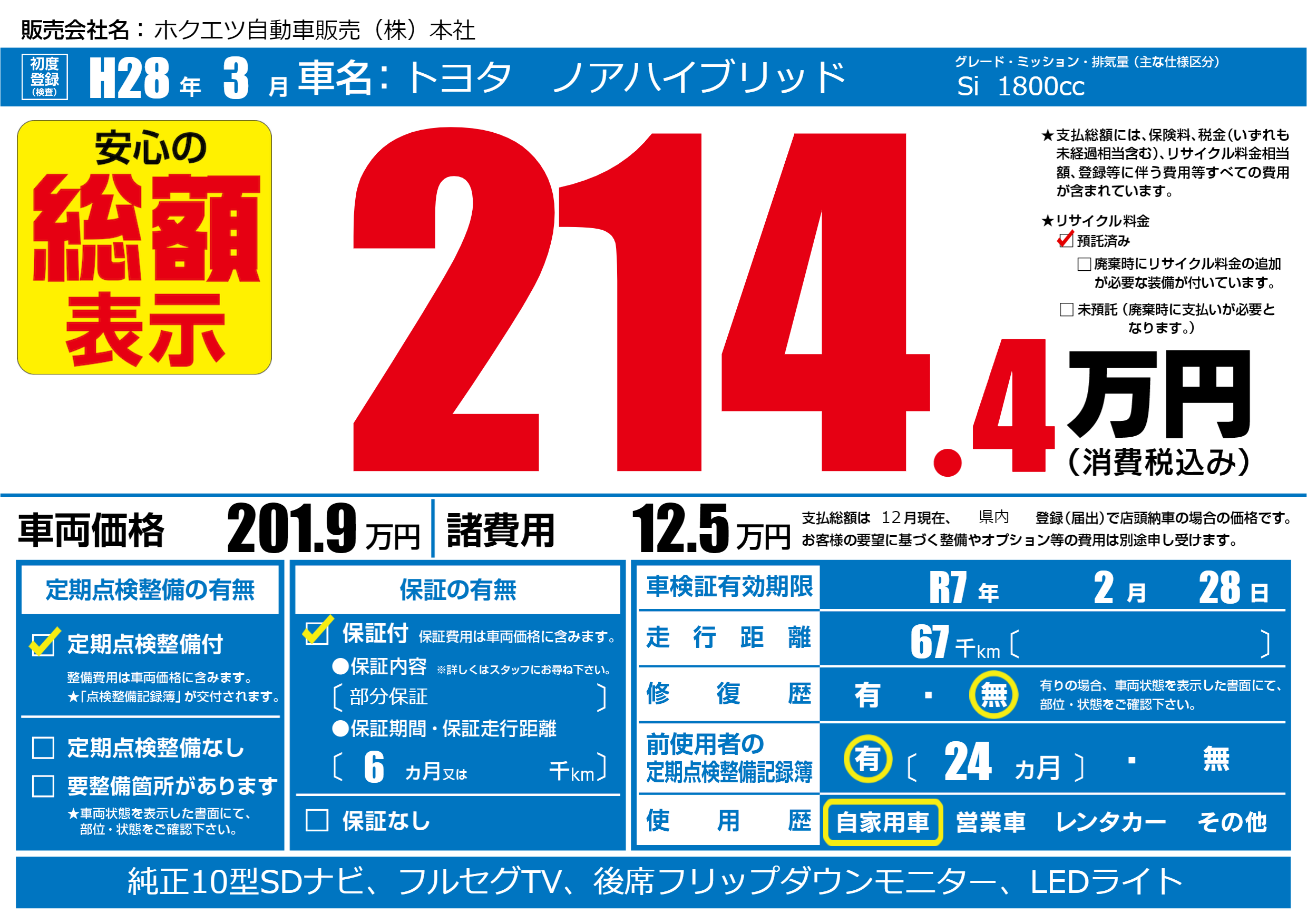 | 車名 | トヨタ ノアハイブリッド | グレード ミッション 排気量 |
