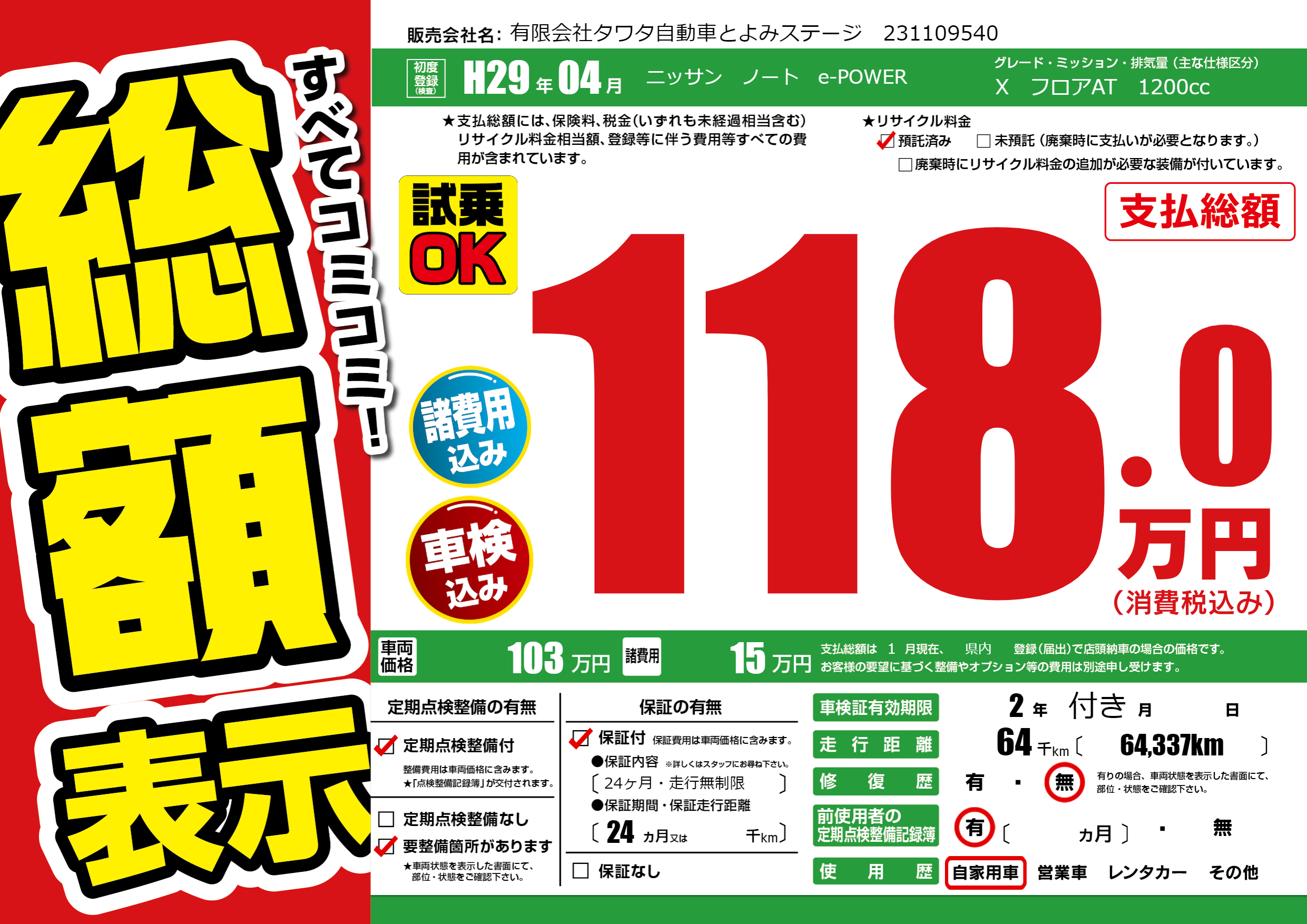 | 車名 | ニッサン ノート e-POWER | グレード ミッション 排気量 |
