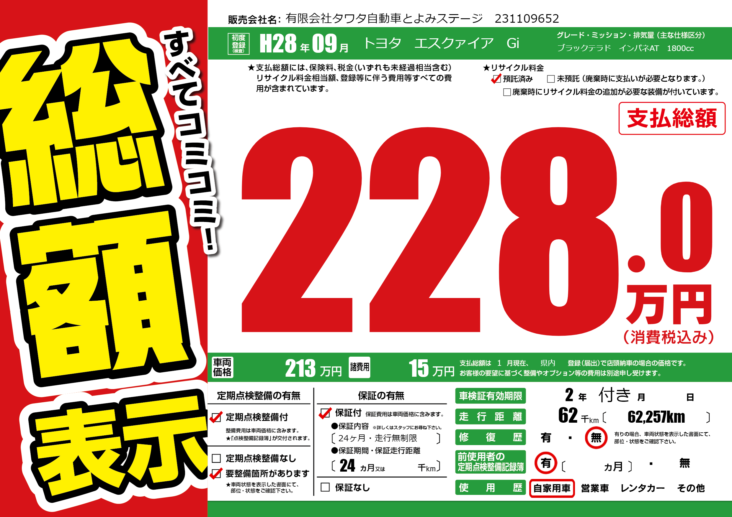 | 車名 | トヨタ エスクァイア Gi | グレード ミッション 排気量 |
