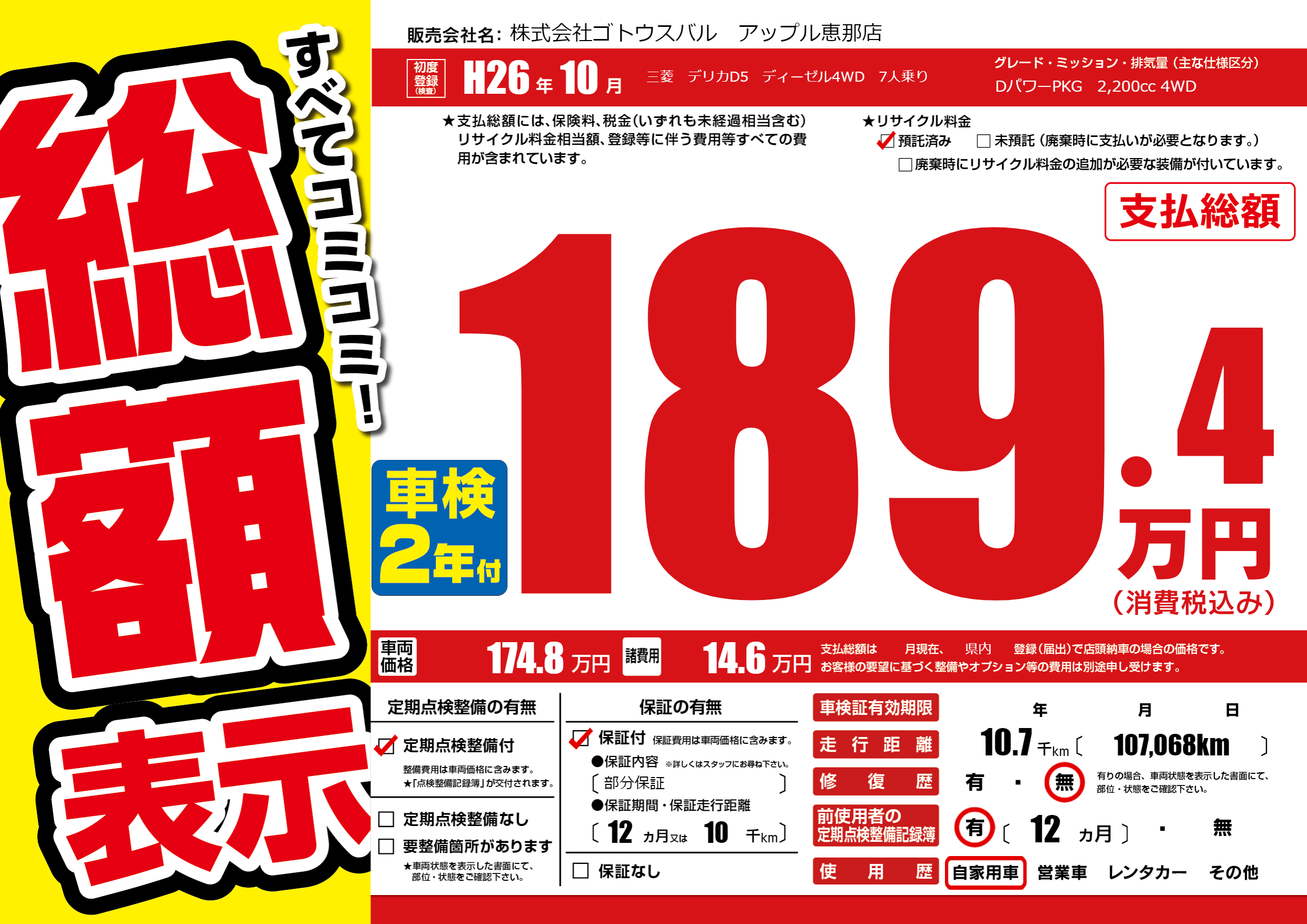 | 車名 | 三菱 デリカD5 ディーゼル4WD 7人乗り | グレード ミッション 排気量 |