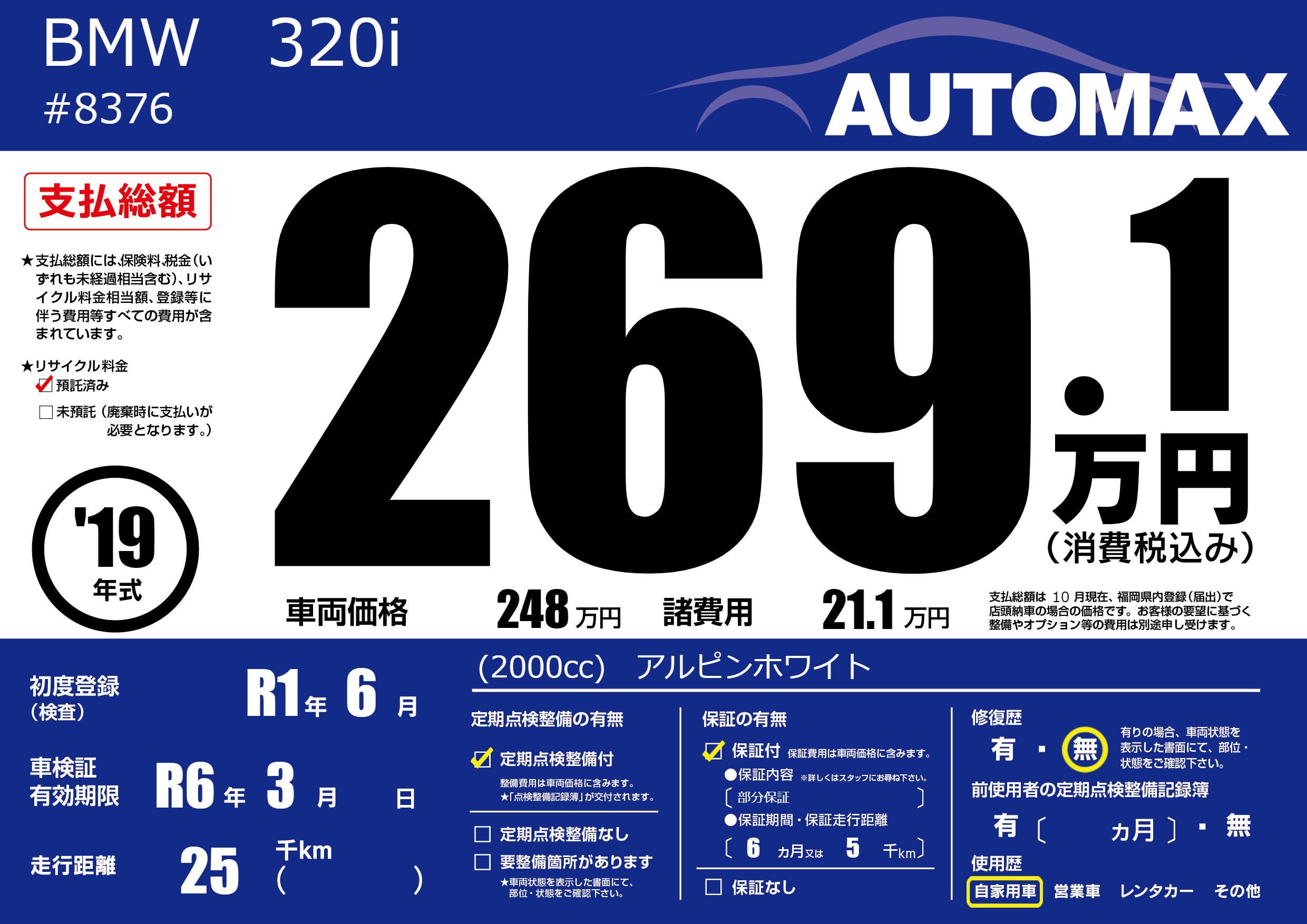 | 車名 | BMW 320i | グレード ミッション 排気量 |