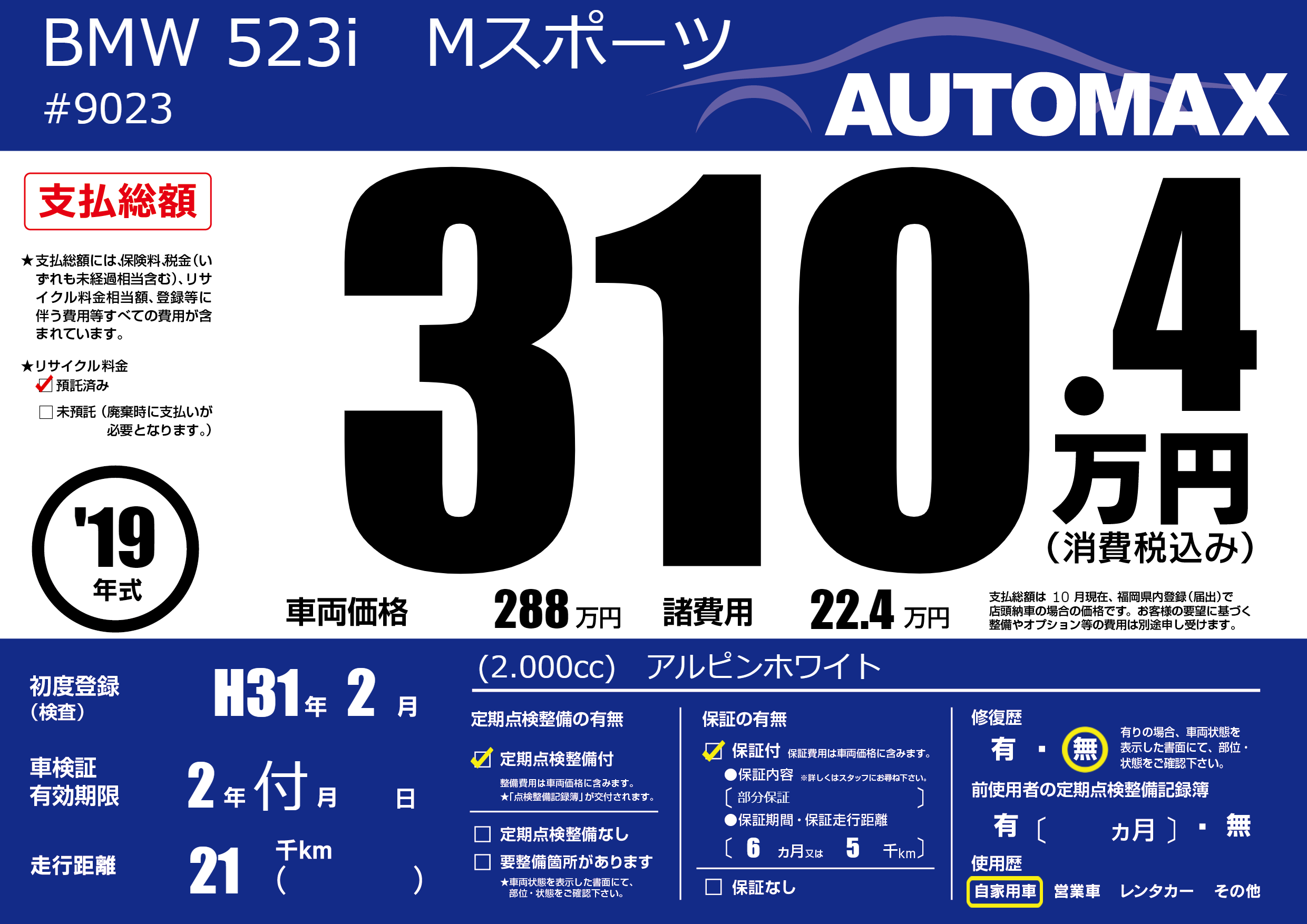 | 車名 | BMW 523i Mスポーツ | グレード ミッション 排気量 |