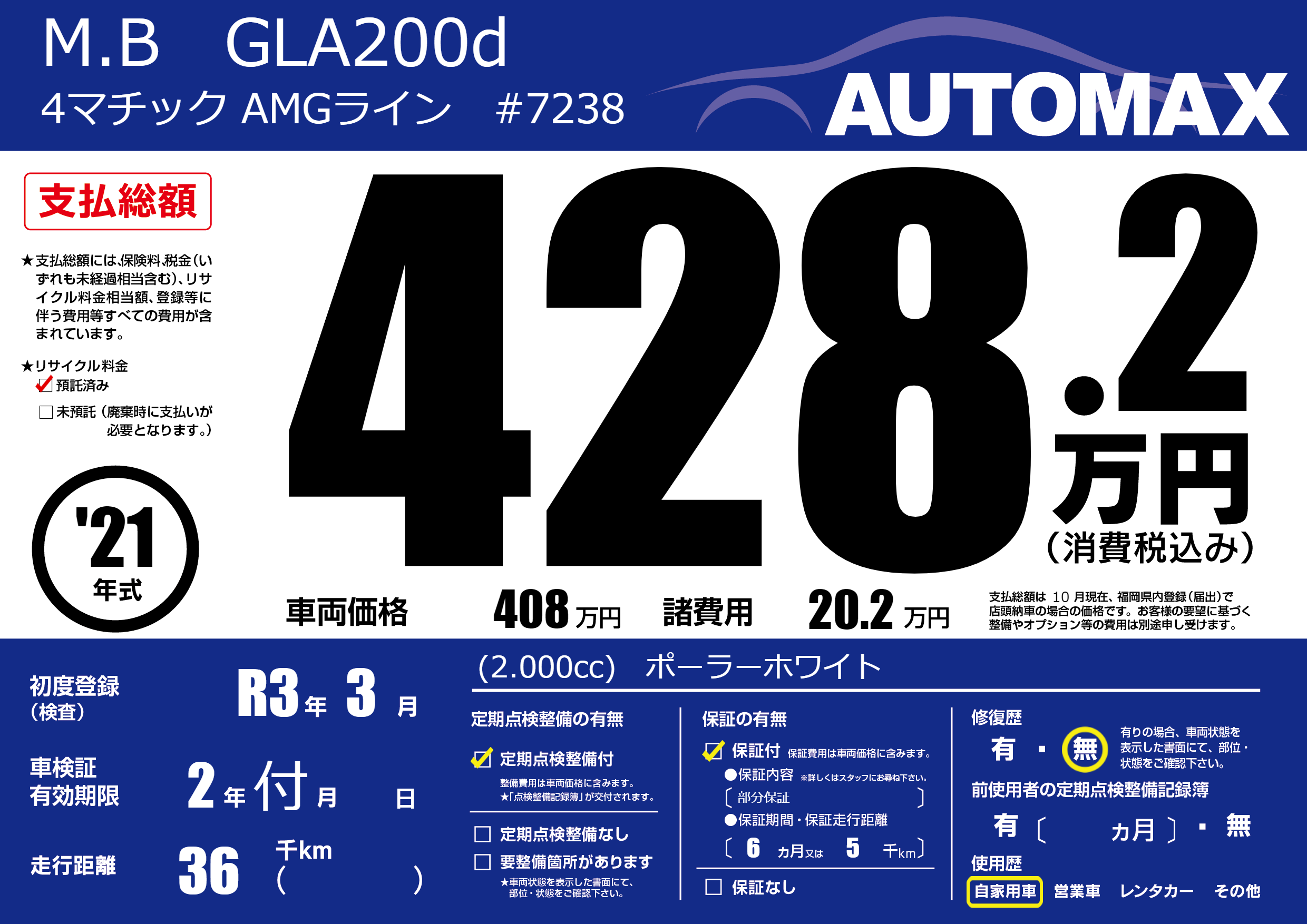 | 車名 | M.B GLA200d | グレード ミッション 排気量 |