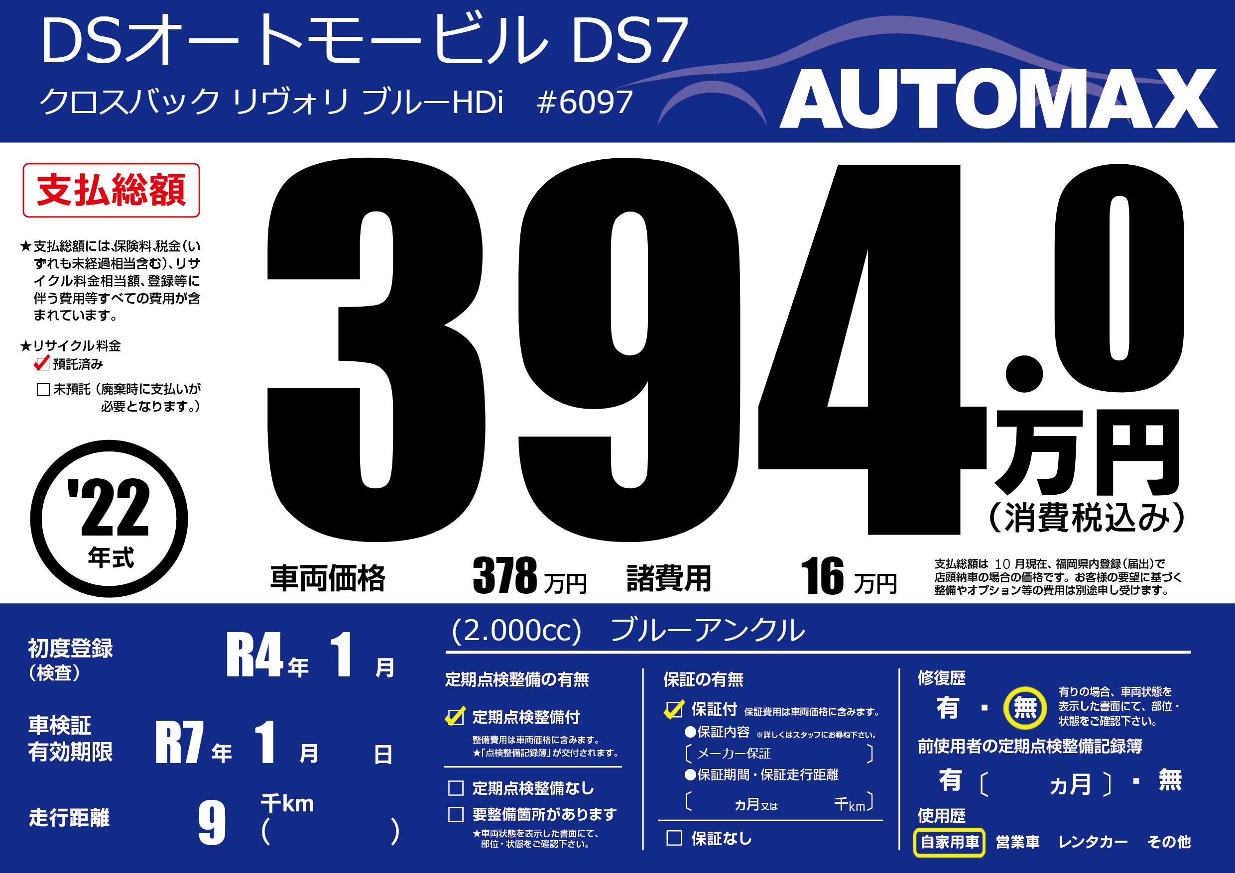 | 車名 | DSオートモービル DS7 | グレード ミッション 排気量 |