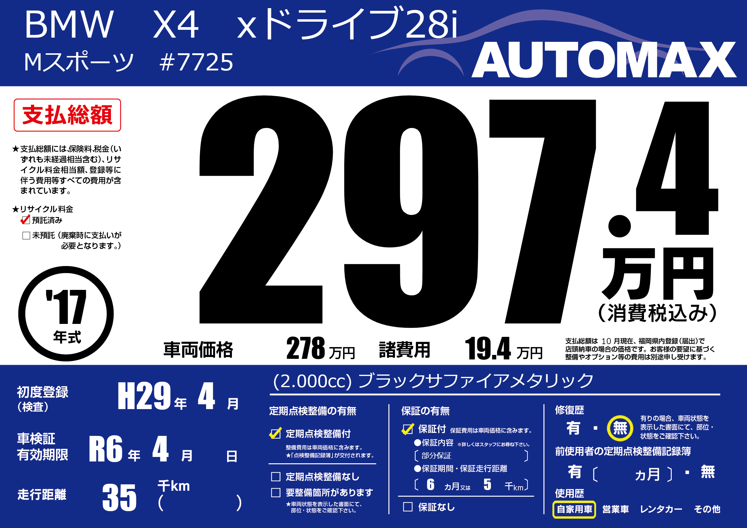 | 車名 | BMW X4 xドライブ28i | グレード ミッション 排気量 |