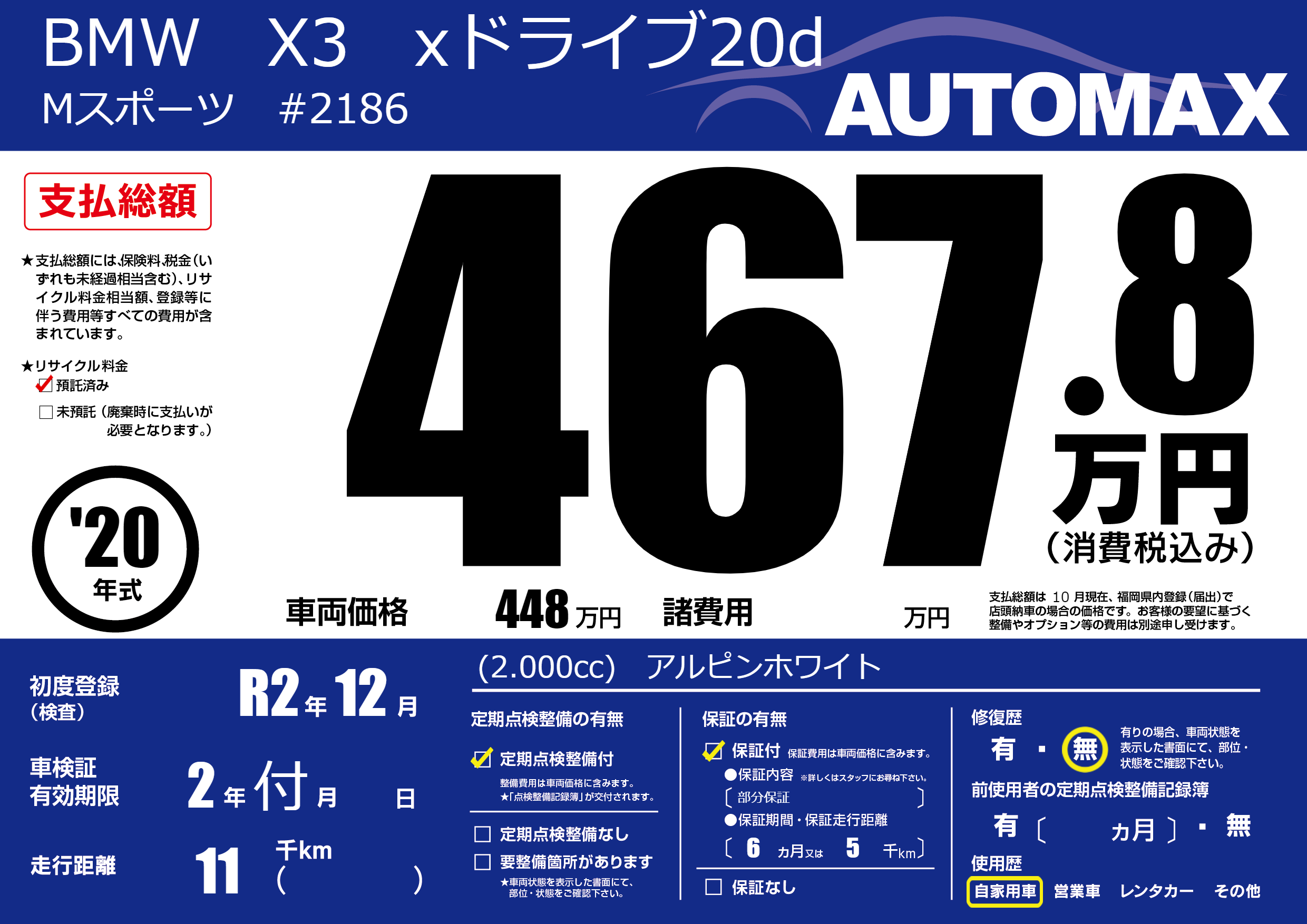 | 車名 | BMW X3 xドライブ20d | グレード ミッション 排気量 |
