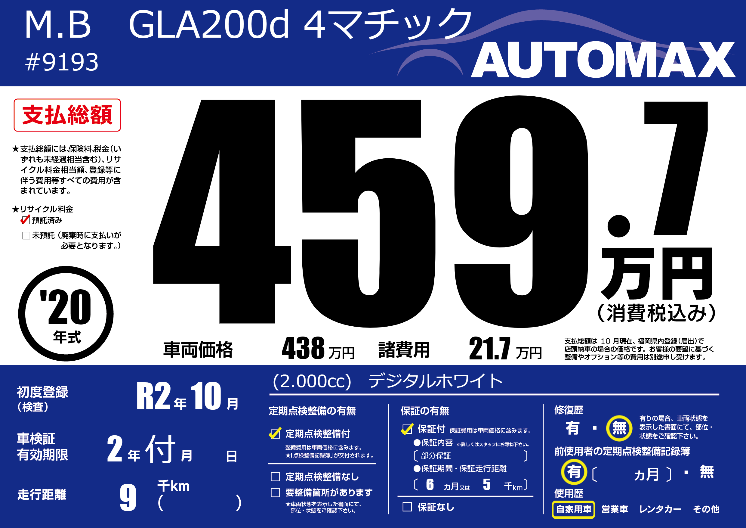| 車名 | M.B GLA200d 4マチック | グレード ミッション 排気量 |