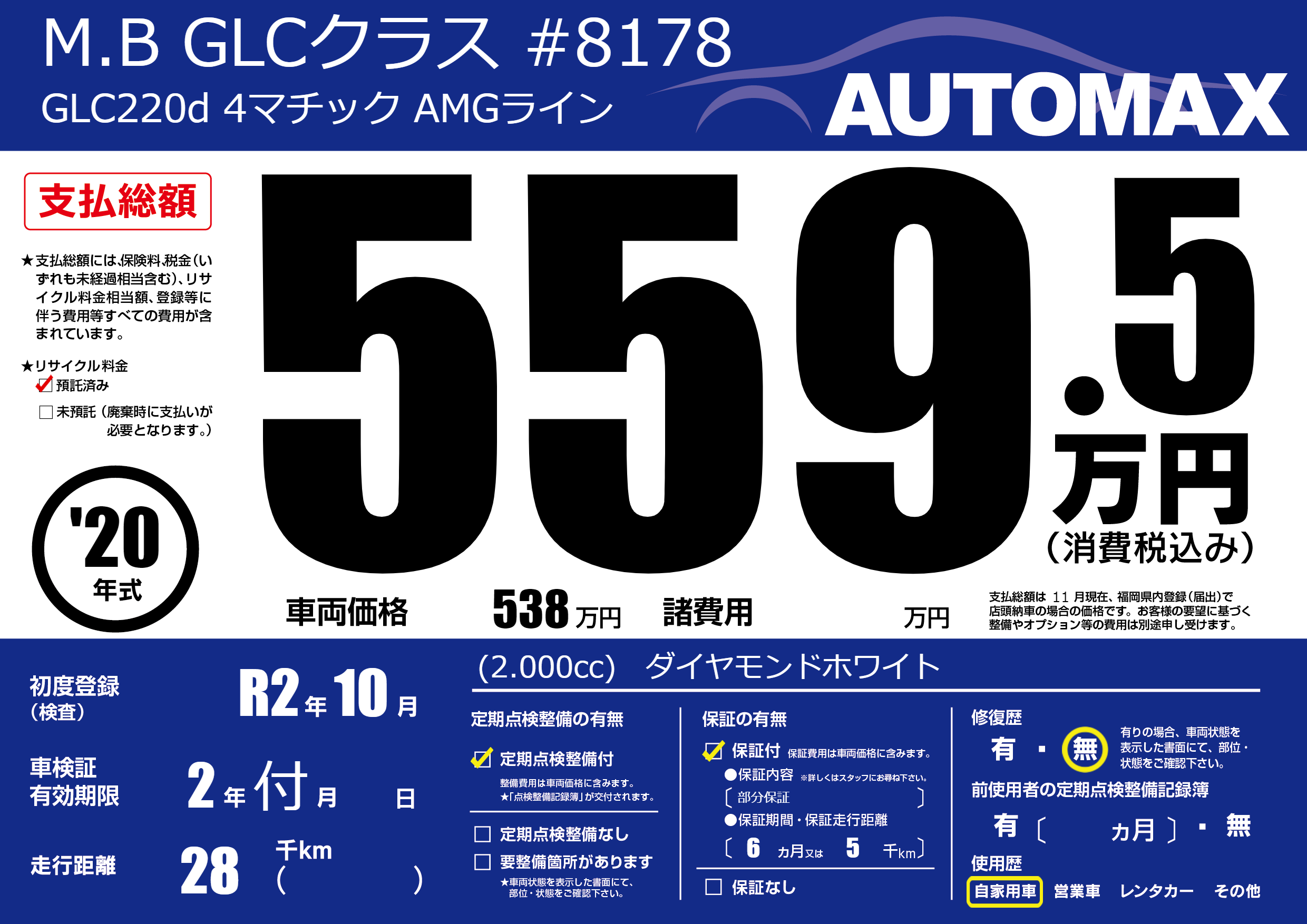 | 車名 | M.B GLCクラス #8178 | グレード ミッション 排気量 |