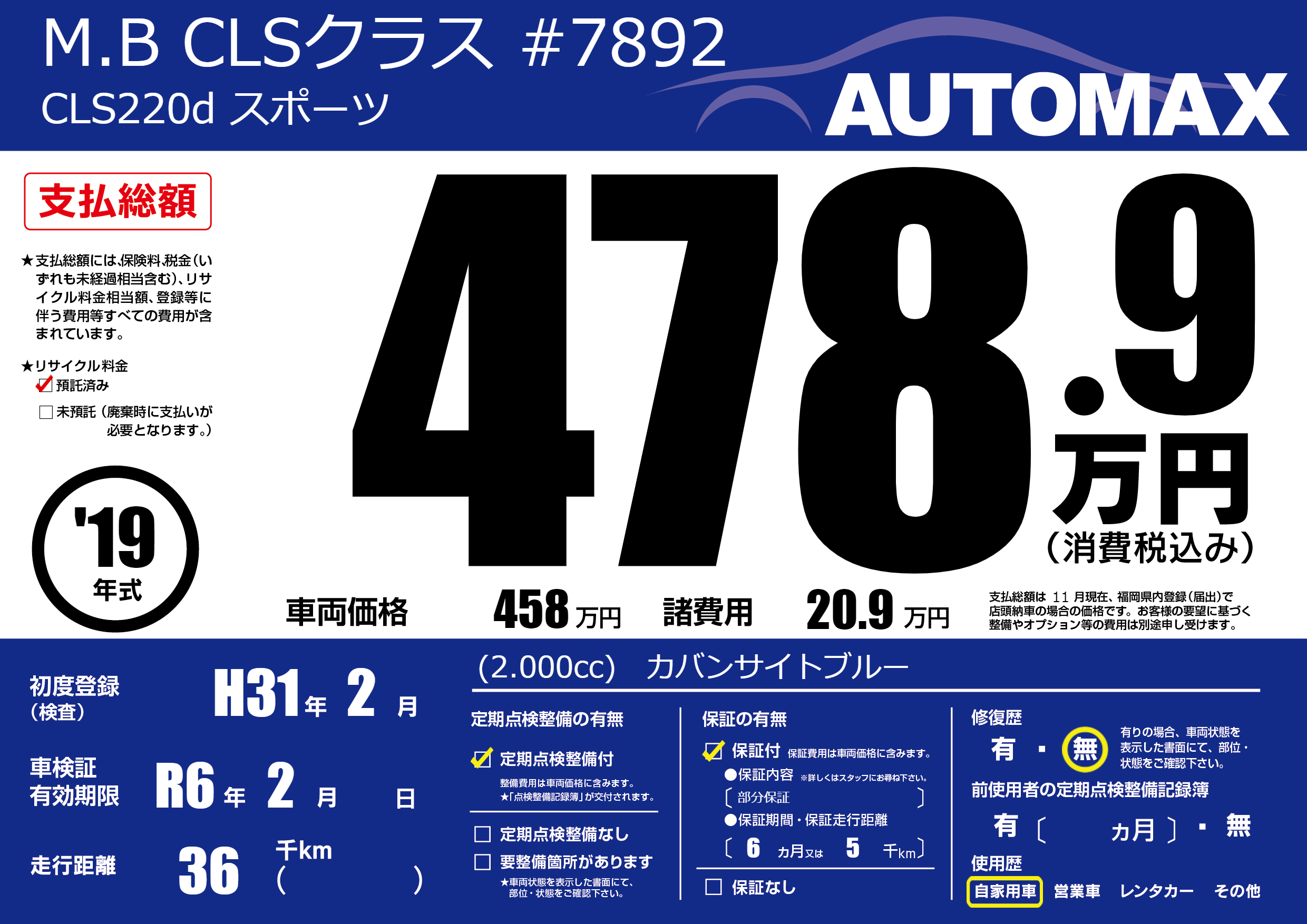 | 車名 | M.B CLSクラス #7892 | グレード ミッション 排気量 |