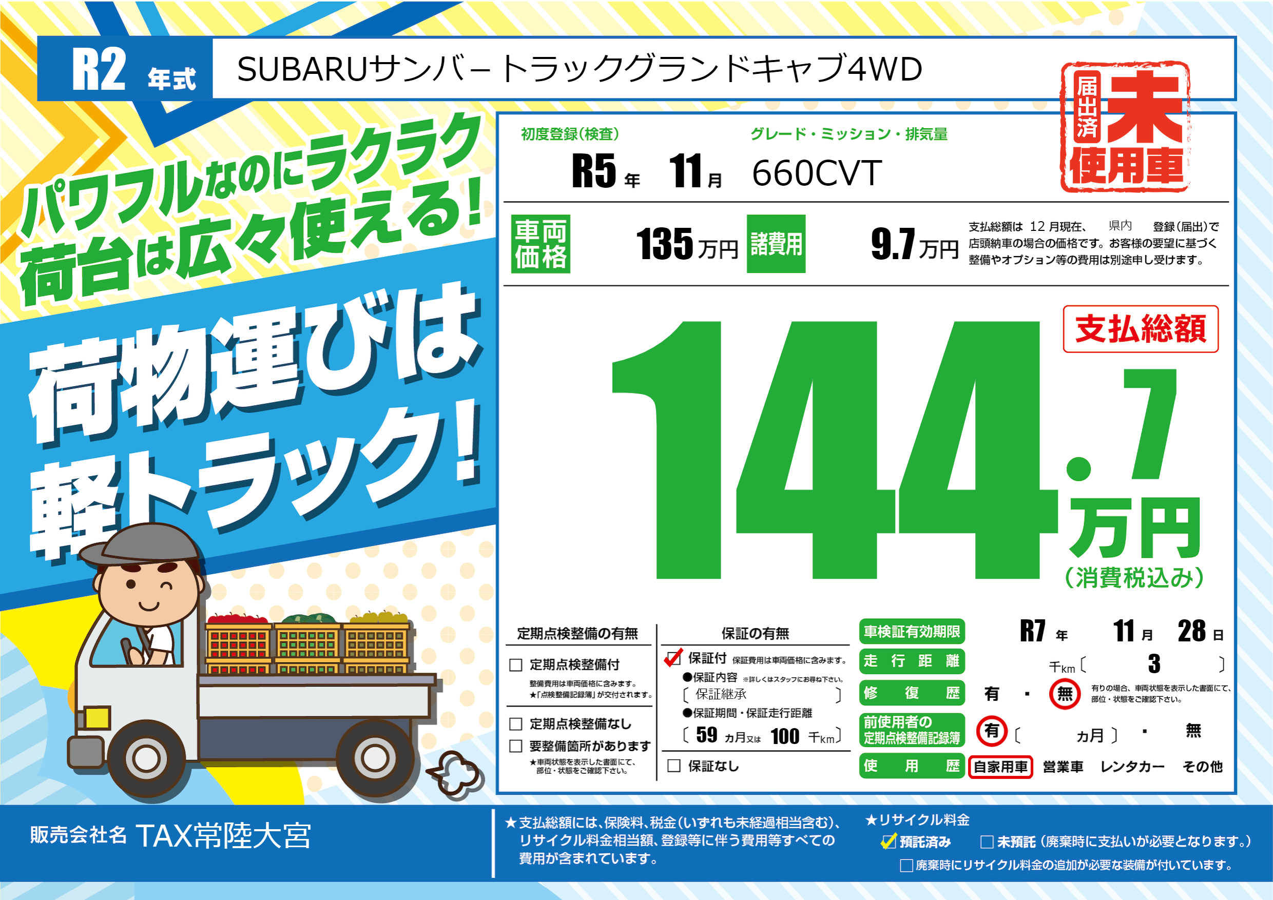 | 車名 | SUBARUサンバ-トラックグランドキャブ4WD | グレード ミッション 排気量 |