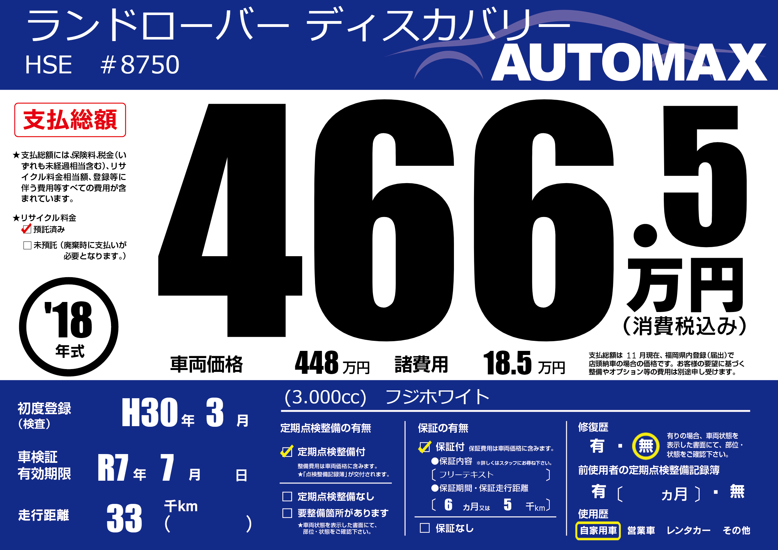 | 車名 | ランドローバー ディスカバリー | グレード ミッション 排気量 |