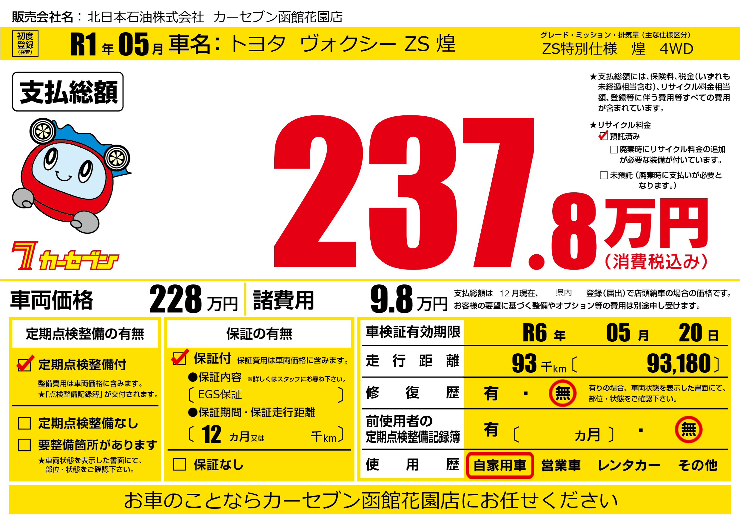 | 走行キロ | 9.3万km | 初年度登録 | R1年05月 |