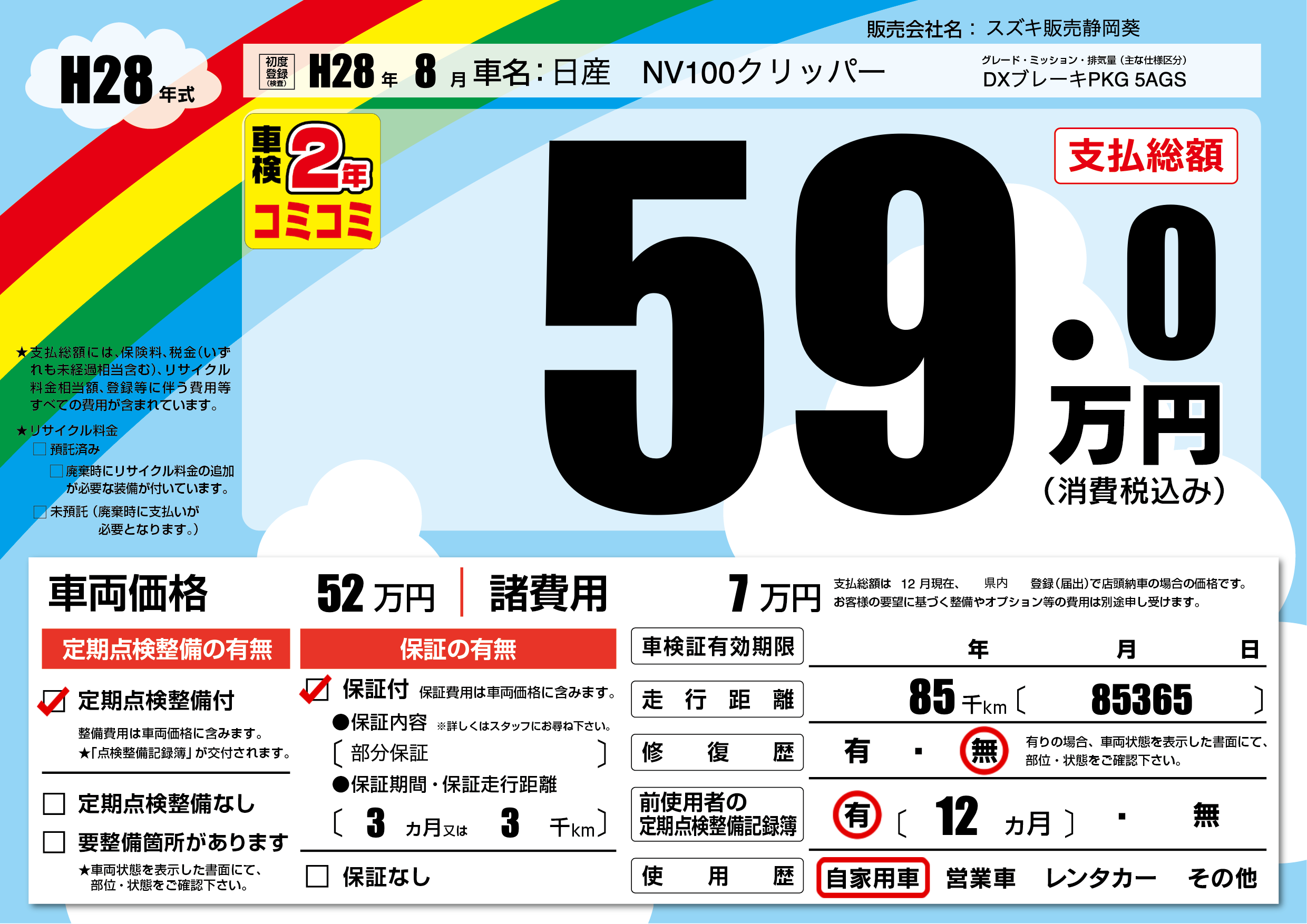 | 走行キロ | 8.5万km | 初年度登録 | H28年8月 |