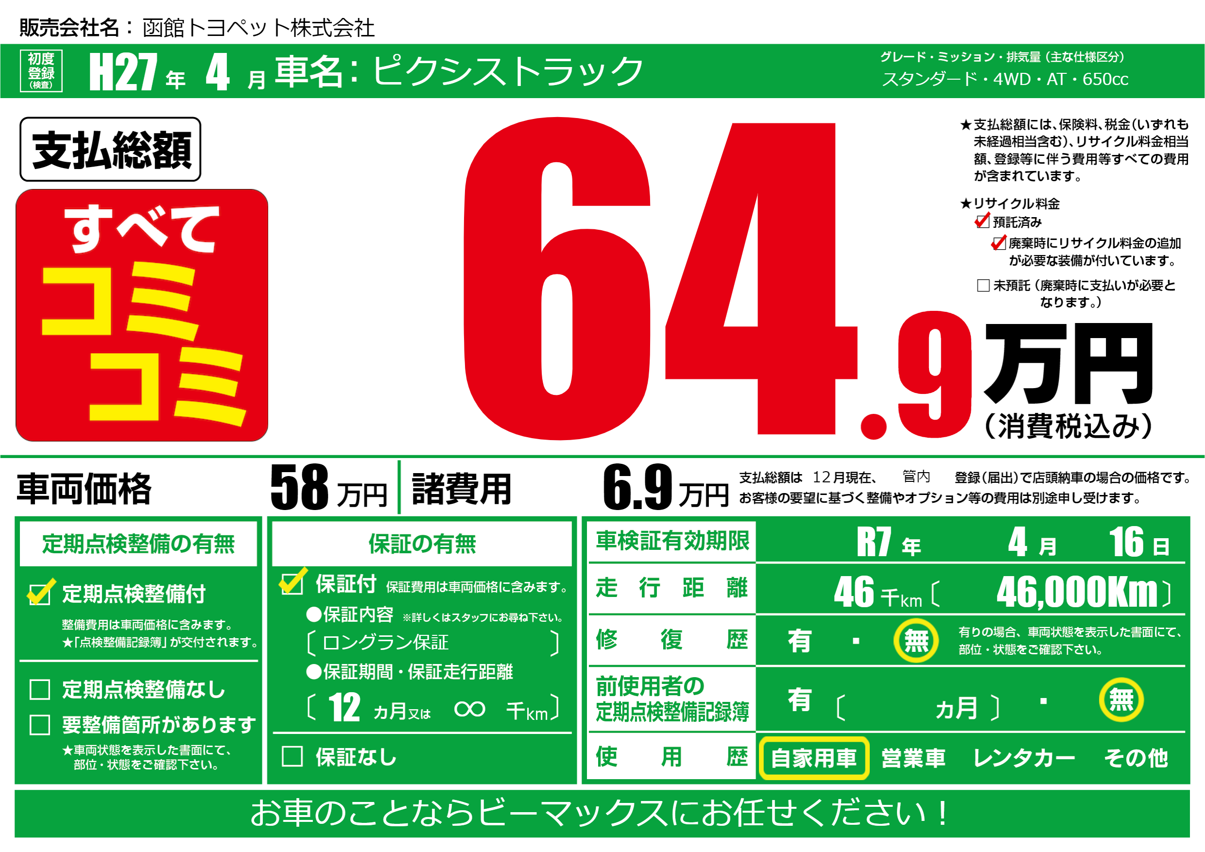| 車名 | ピクシストラック | グレード ミッション 排気量 |