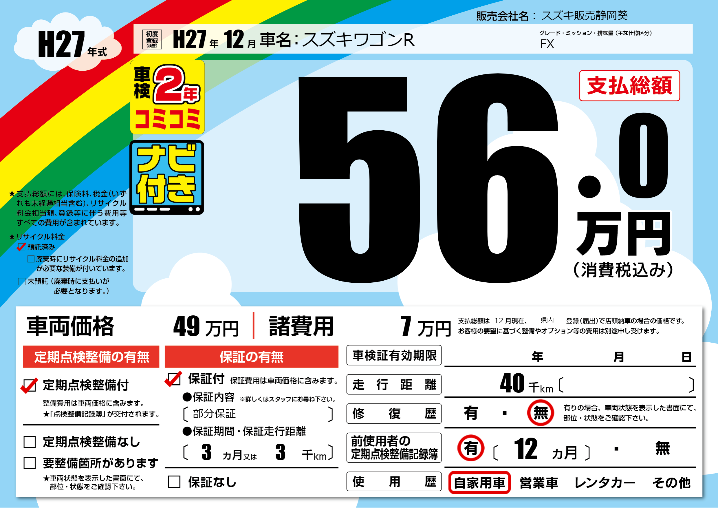 | 車名 | スズキワゴンR | グレード ミッション 排気量 |