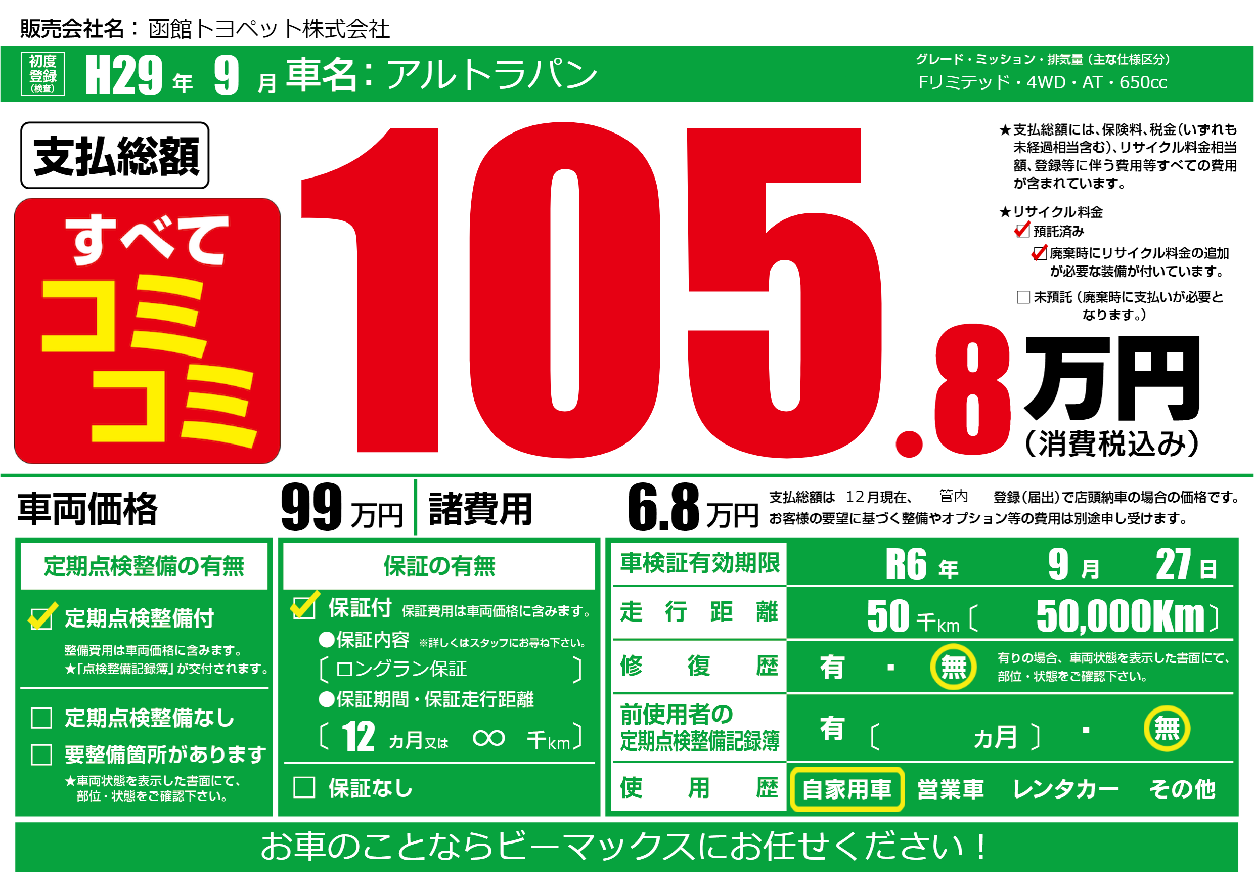 | 走行キロ | 5万km | 初年度登録 | H29年9月 |