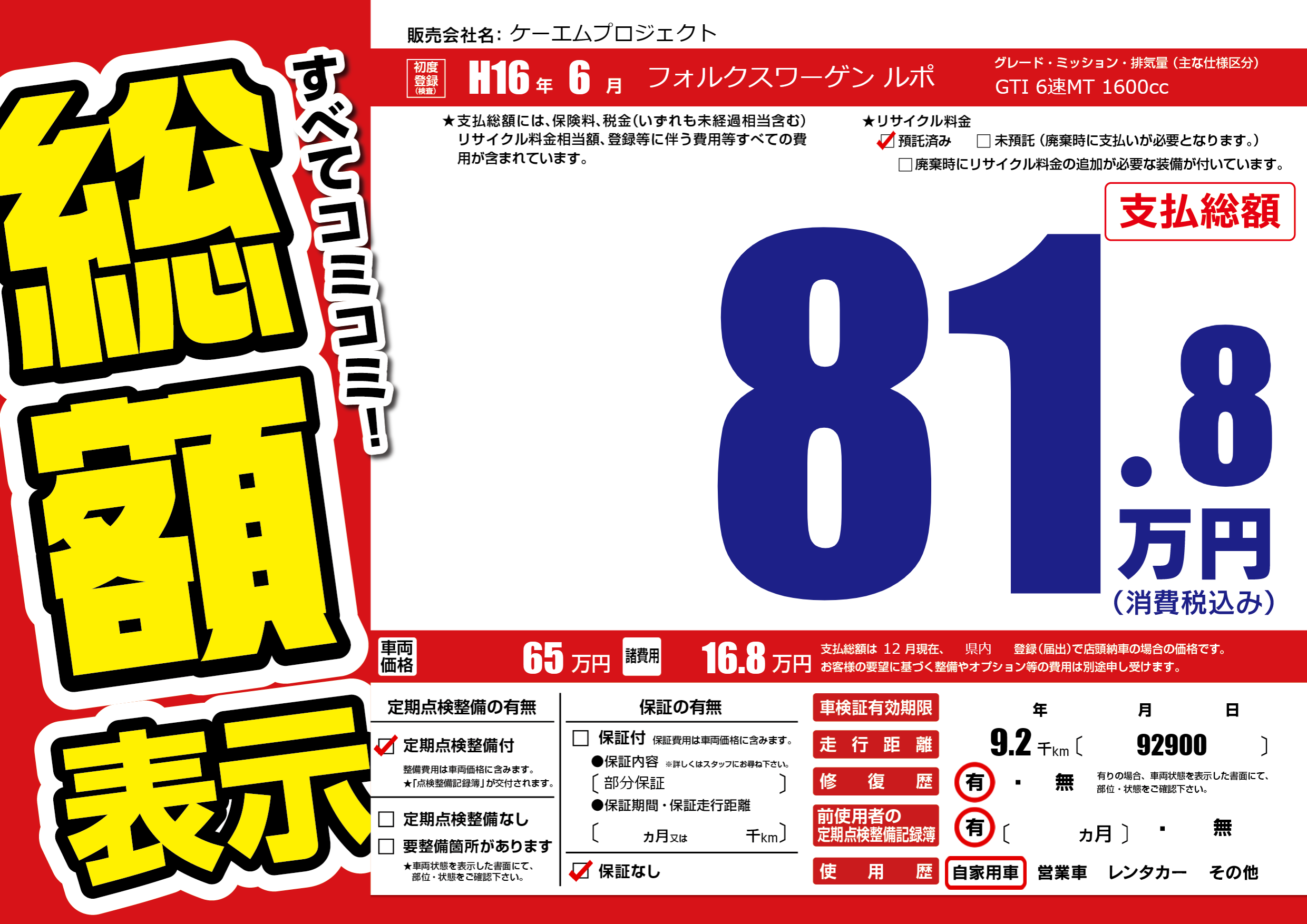 | 車名 | フォルクスワーゲン ルポ | グレード ミッション 排気量 |