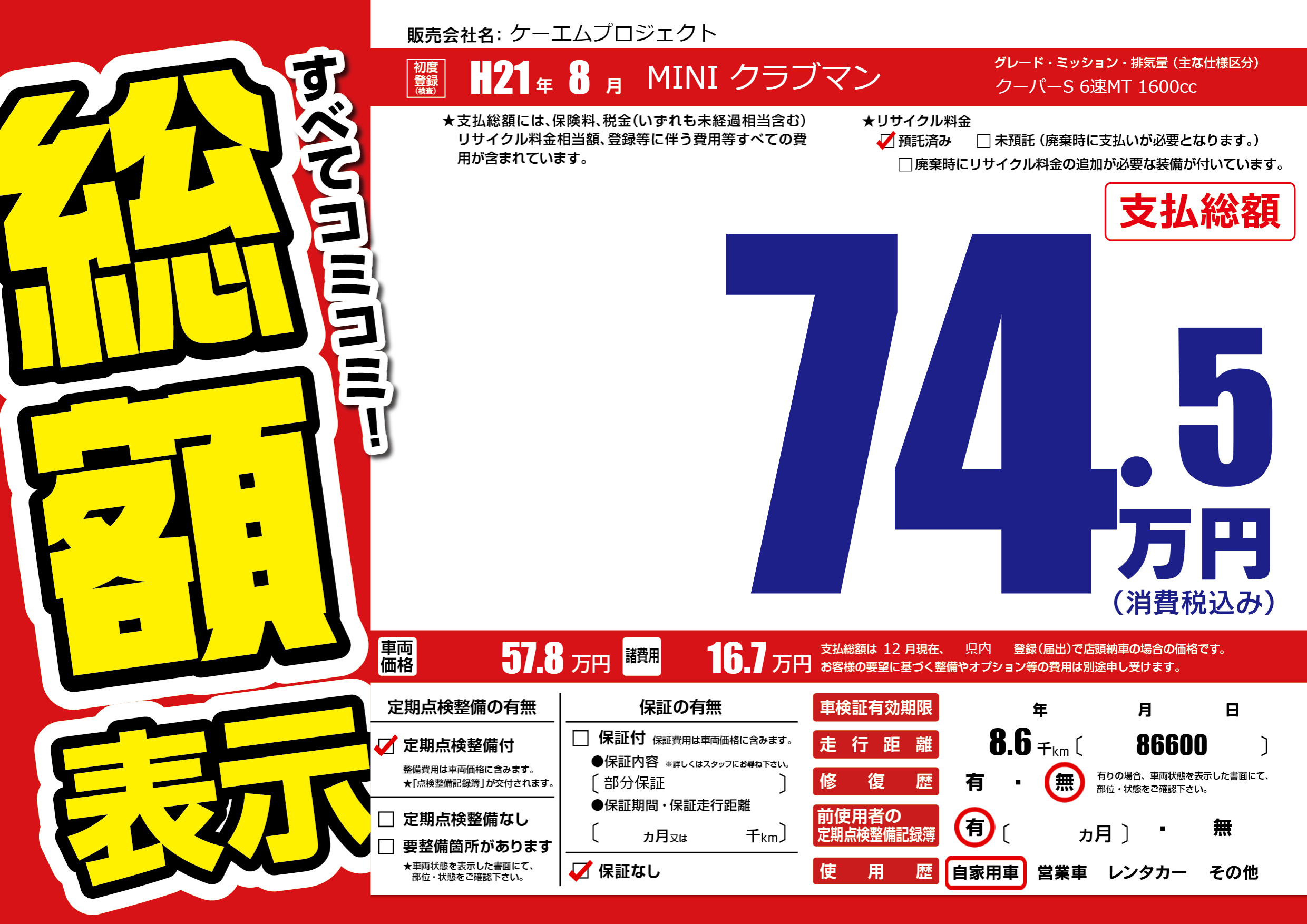 | 走行キロ | 0.8万km | 初年度登録 | H21年8月 |
