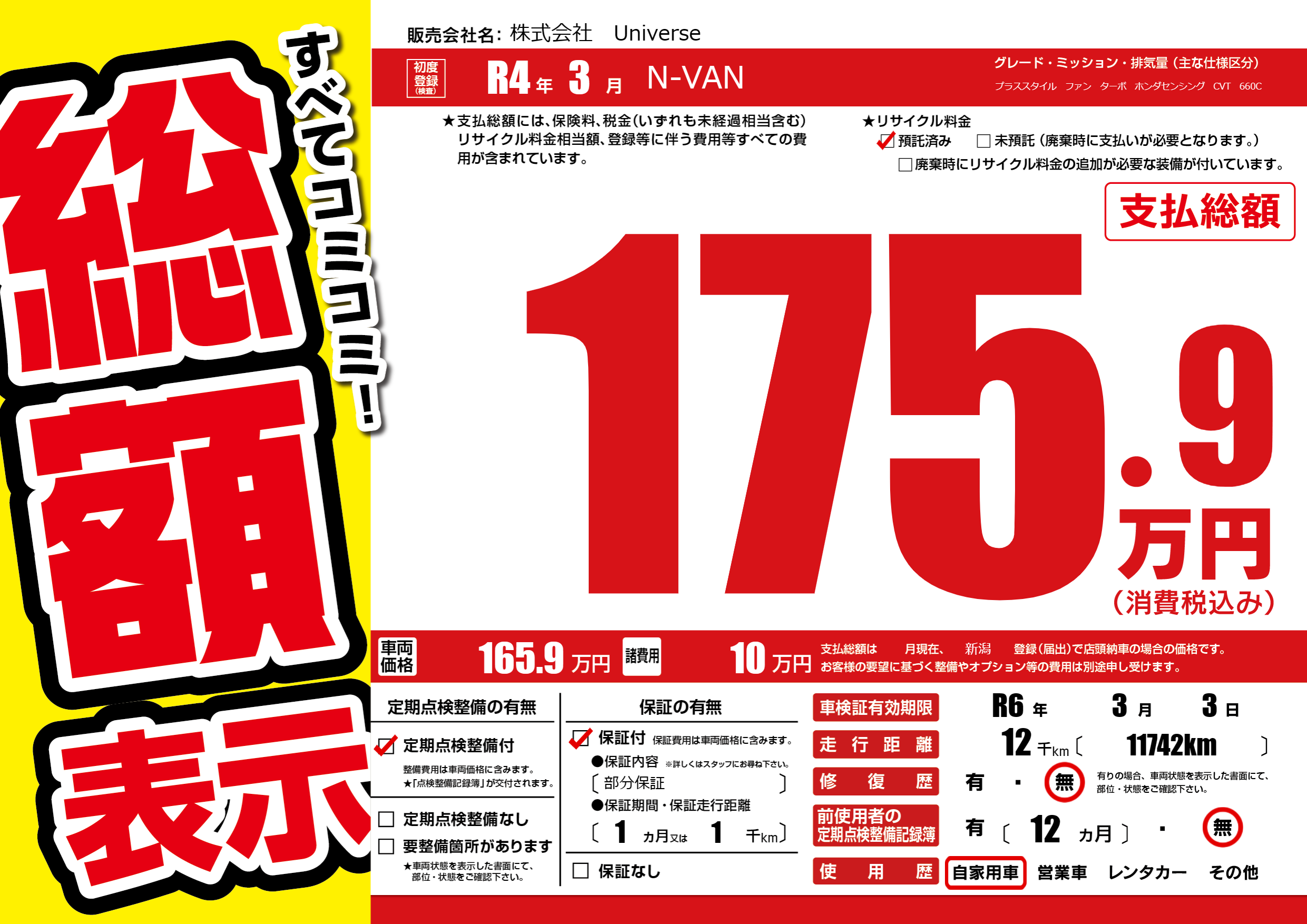 | 車名 | N-VAN | グレード ミッション 排気量 |