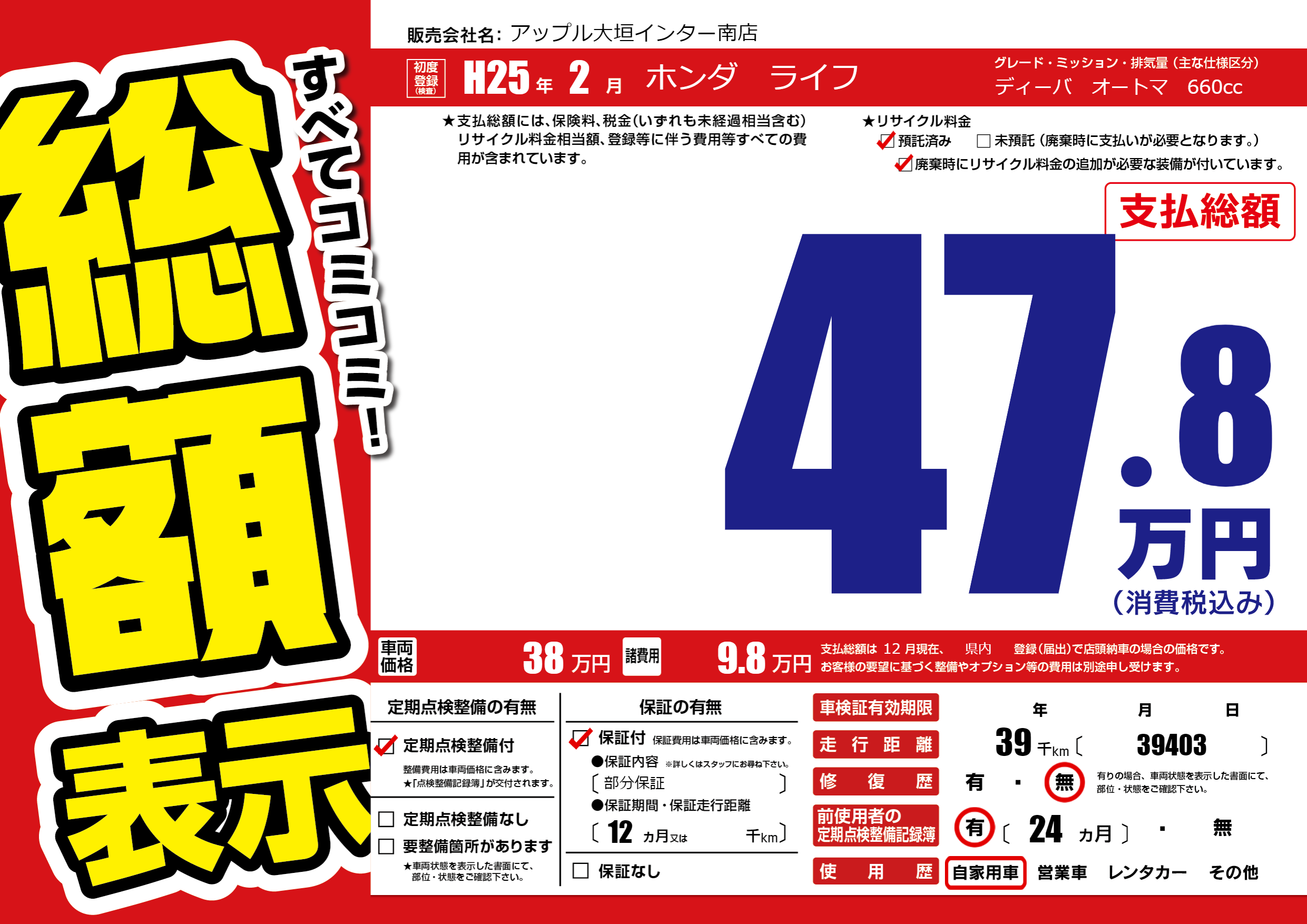 | 走行キロ | 3.9万km | 初年度登録 | H25年2月 |