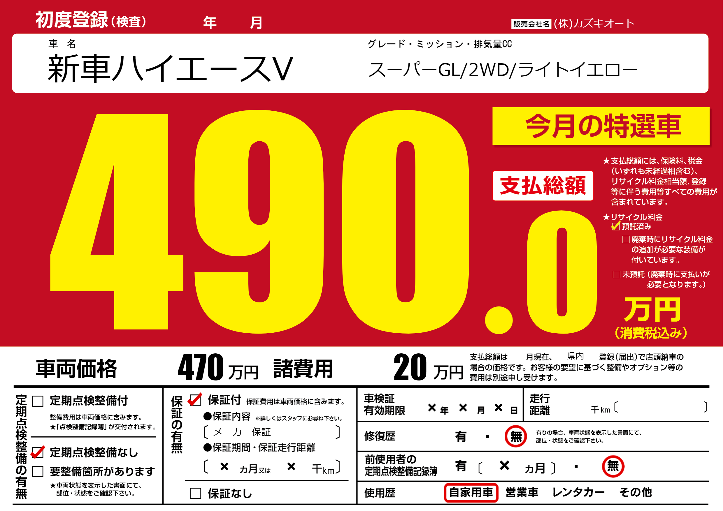 | 車名 | 新車ハイエースV | グレード ミッション 排気量 |