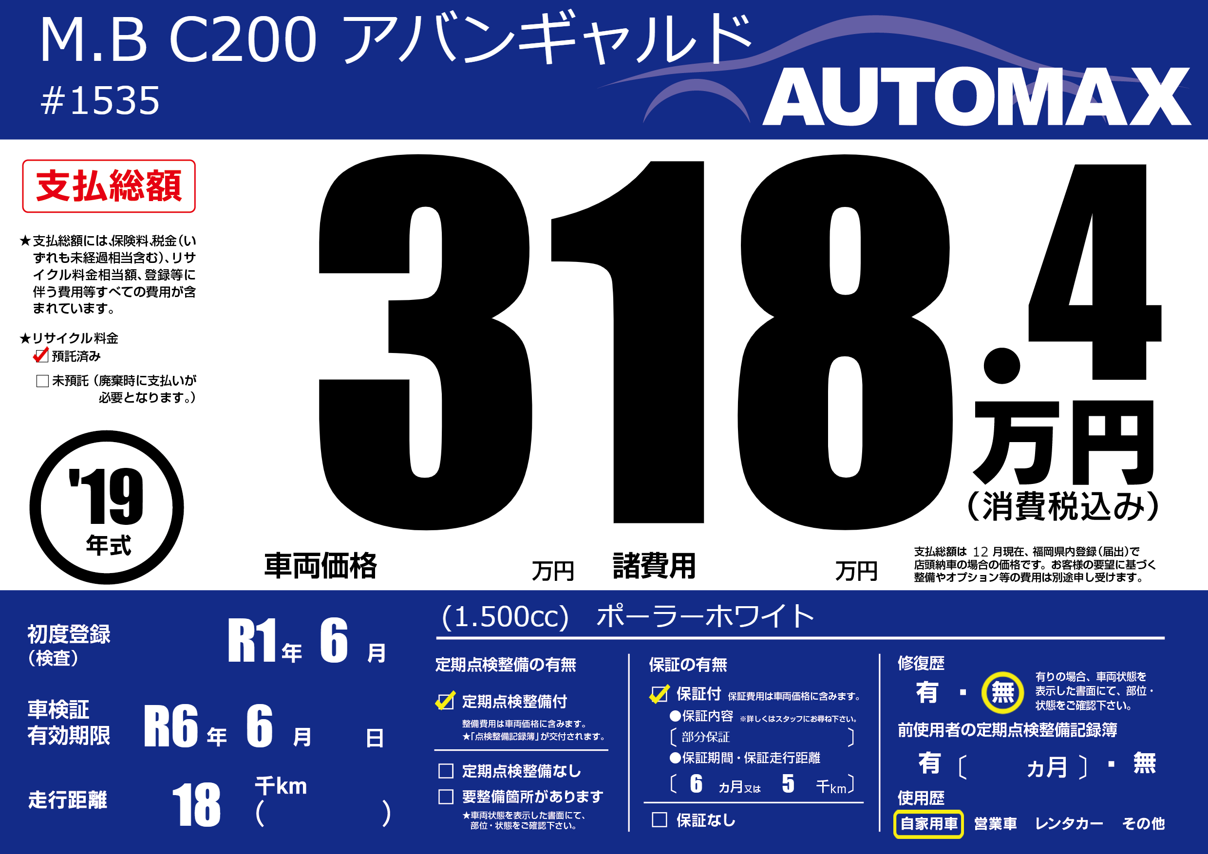 | 車名 | M.B C200 アバンギャルド | グレード ミッション 排気量 |