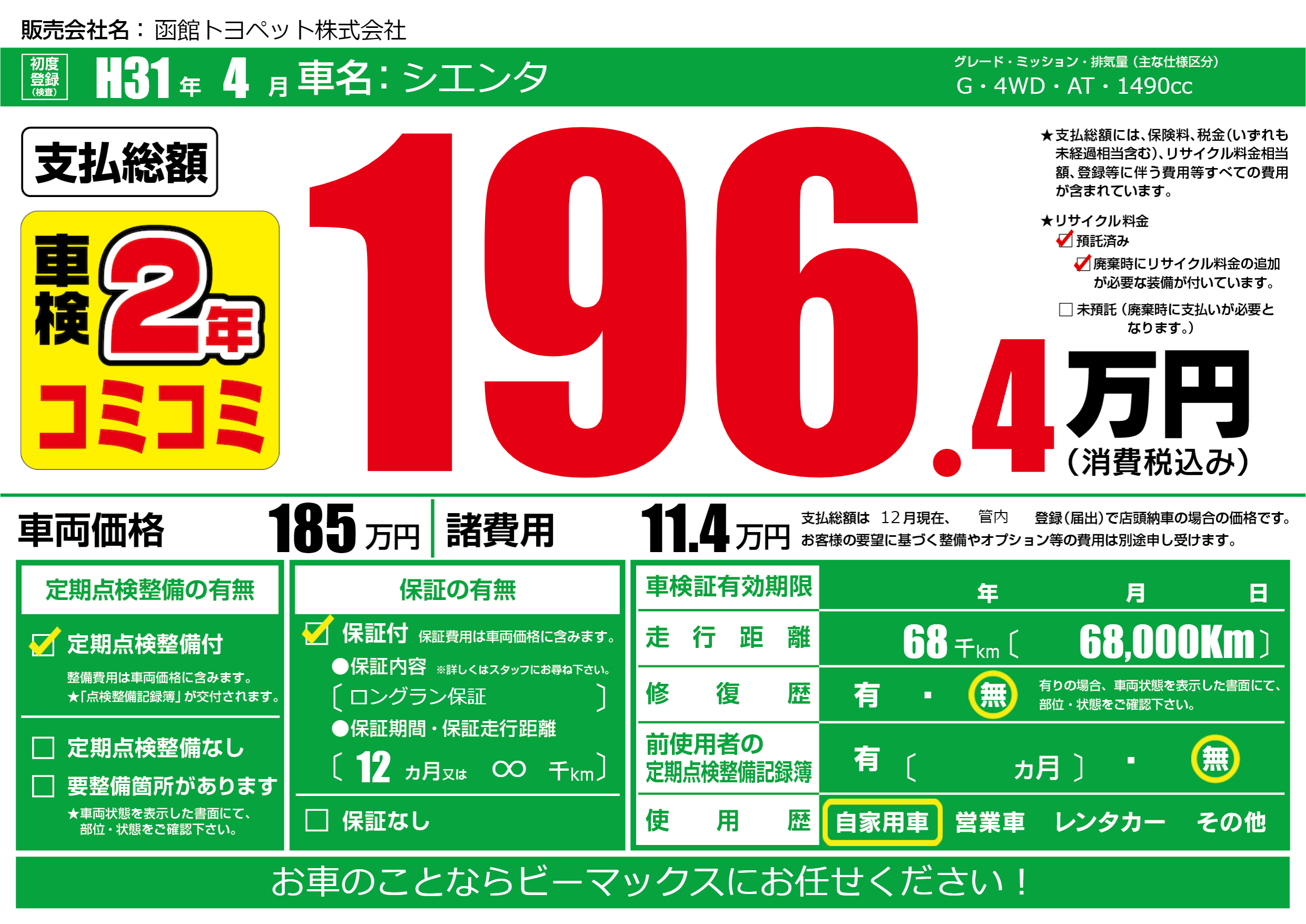 | 車名 | シエンタ | グレード ミッション 排気量 |