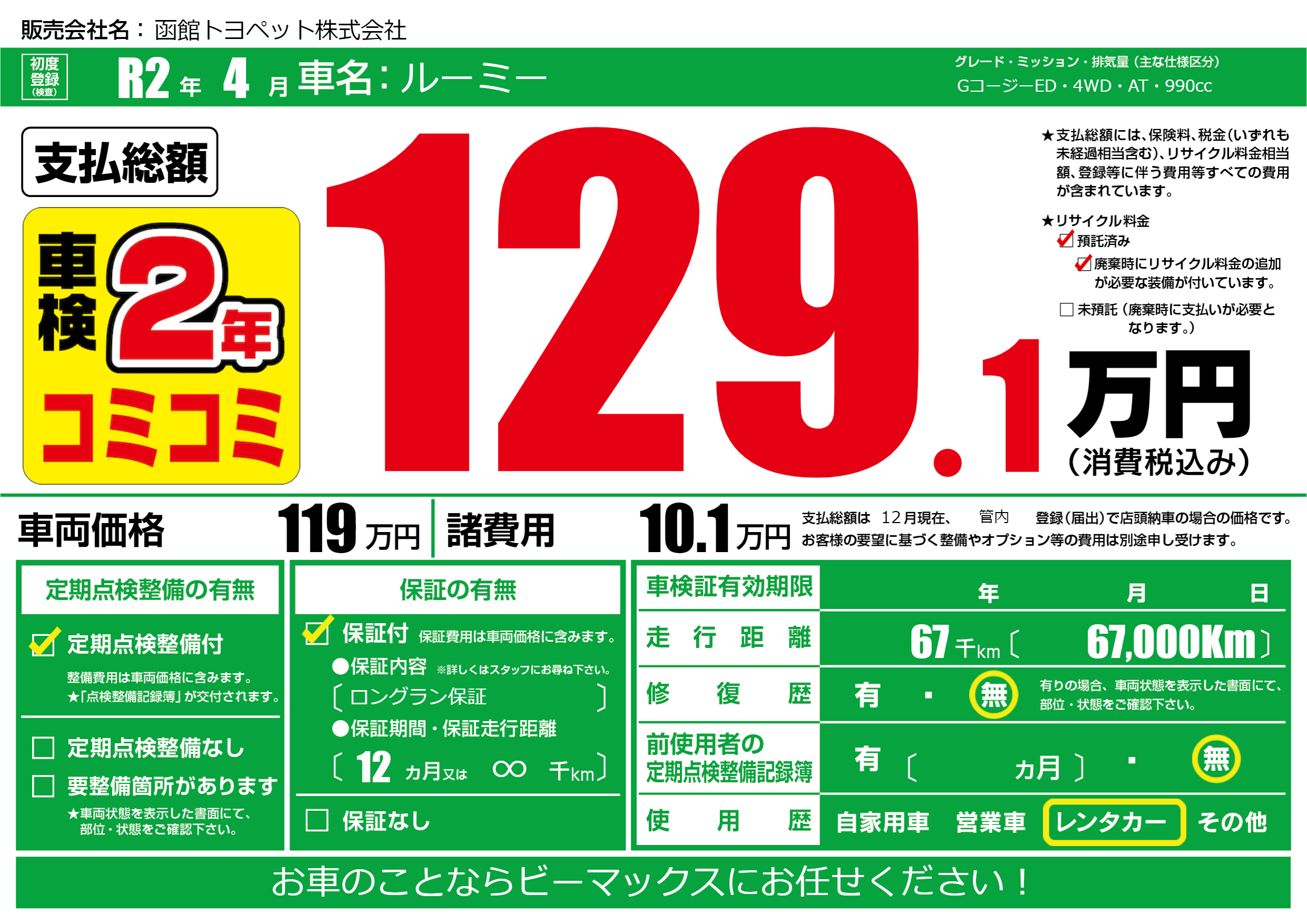 | 車名 | ルーミー | グレード ミッション 排気量 |