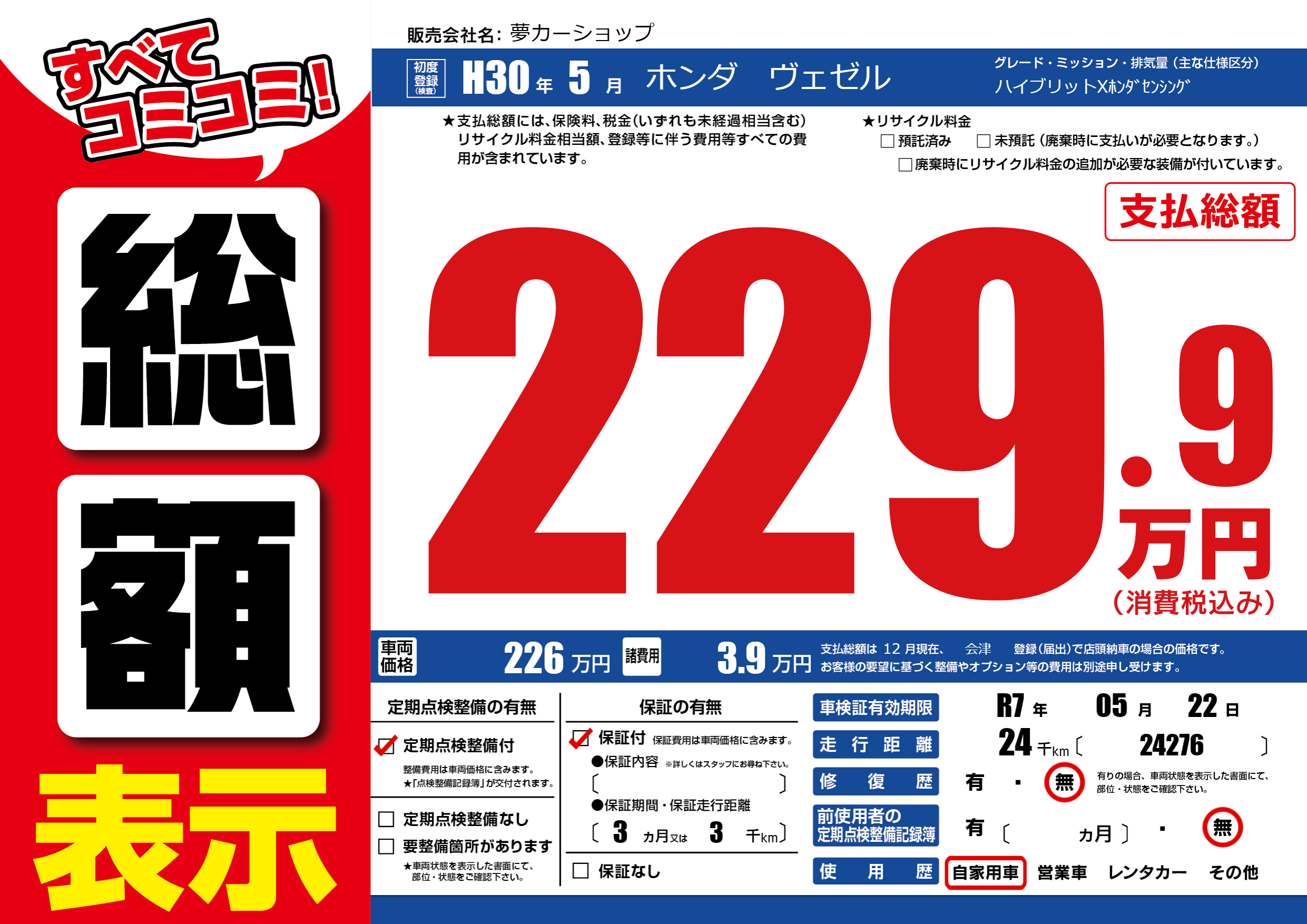 | 車名 | ホンダ ヴェゼル | グレード ミッション 排気量 |
