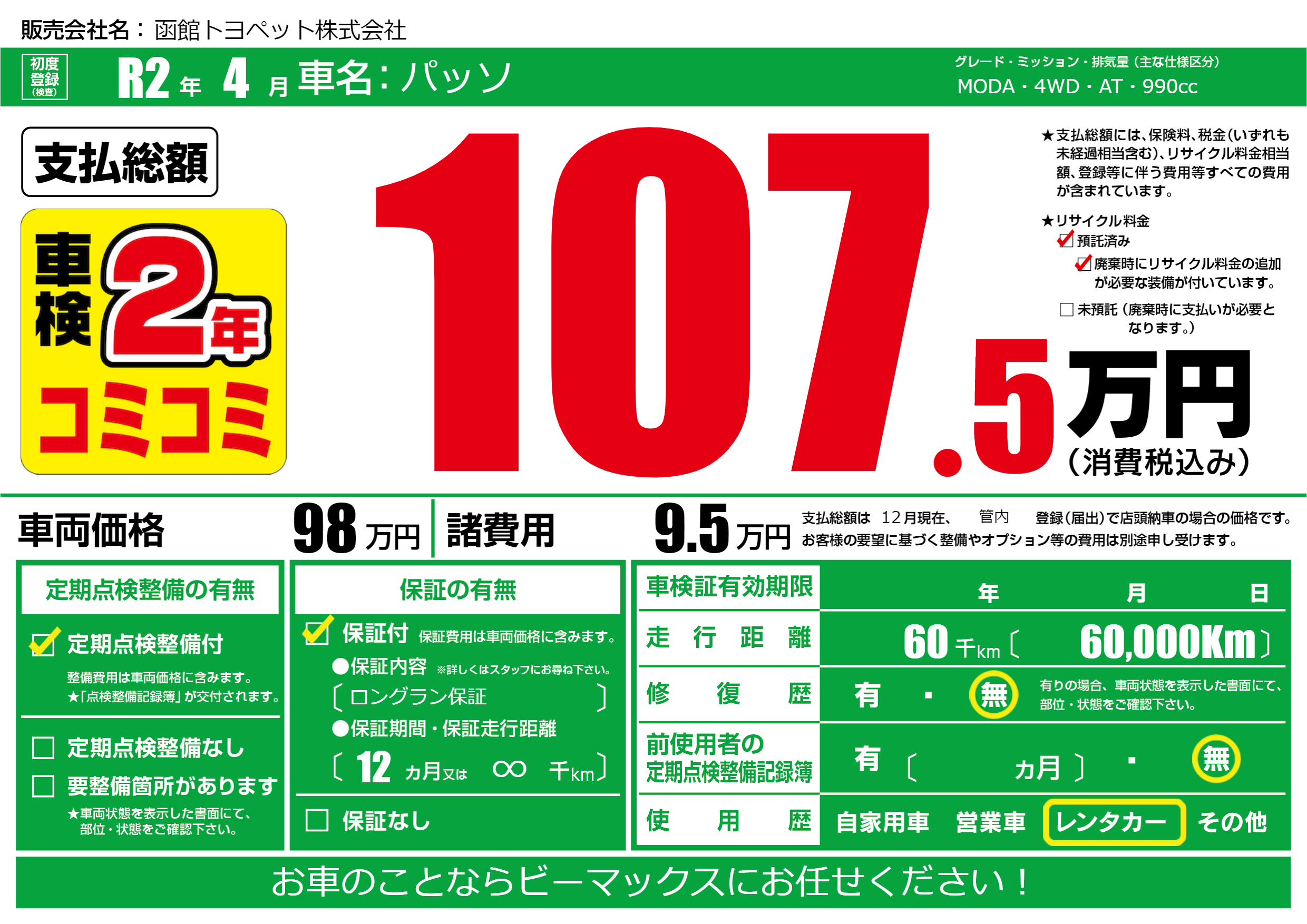| 定期点検整備 | 定期点検整備あり | ||