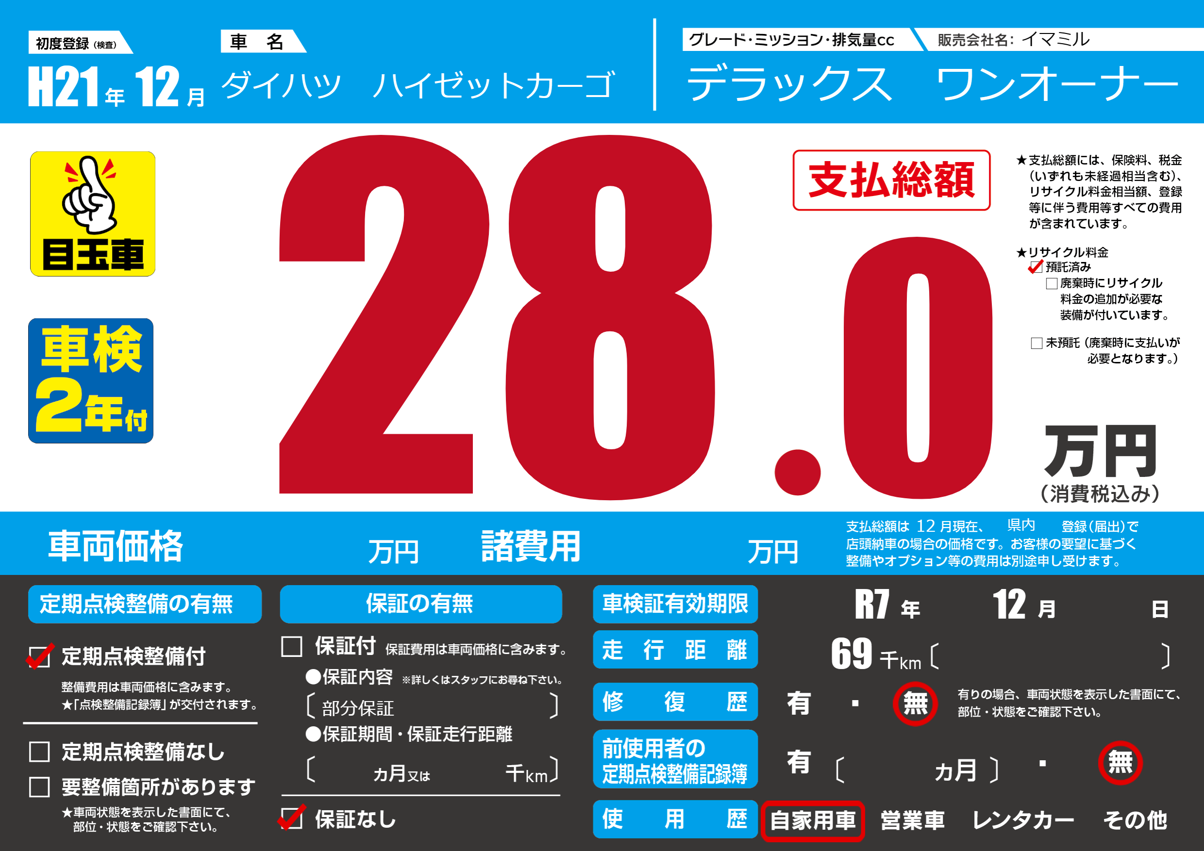 | 走行キロ | 6.9万km | 初年度登録 | H21年12月 |