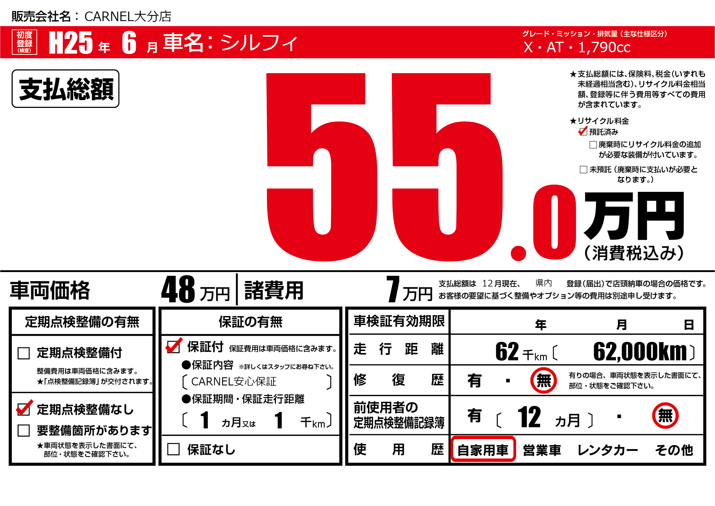 | 車名 | シルフィ | グレード ミッション 排気量 |