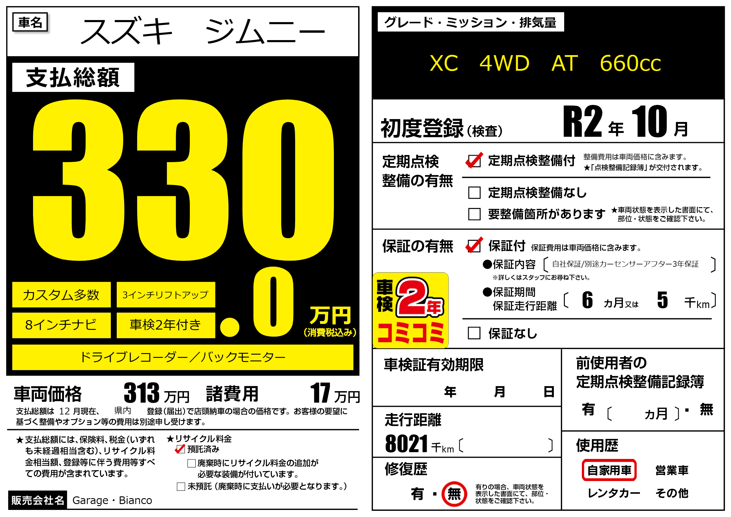 | 車名 | スズキ ジムニー | グレード ミッション 排気量 |
