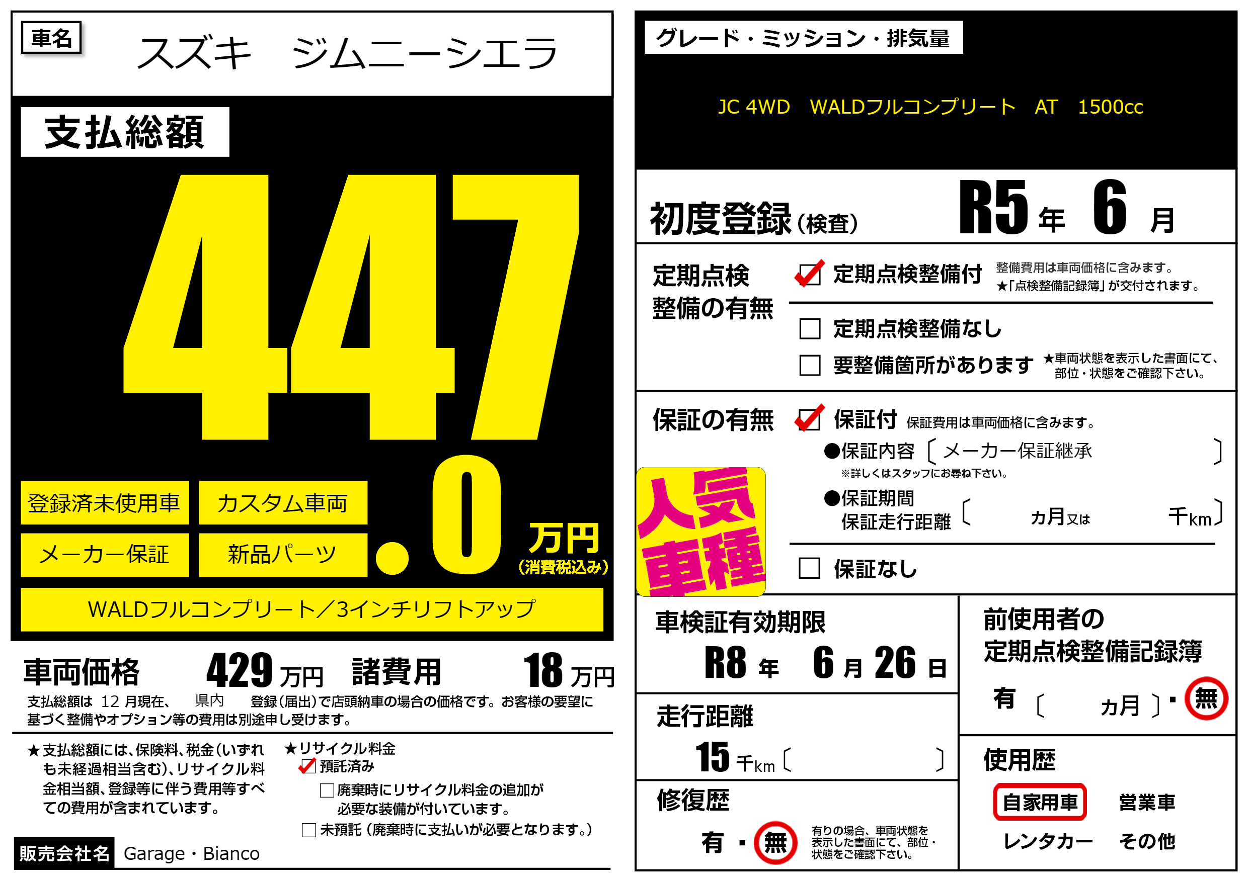 | 車名 | スズキ ジムニーシエラ | グレード ミッション 排気量 |