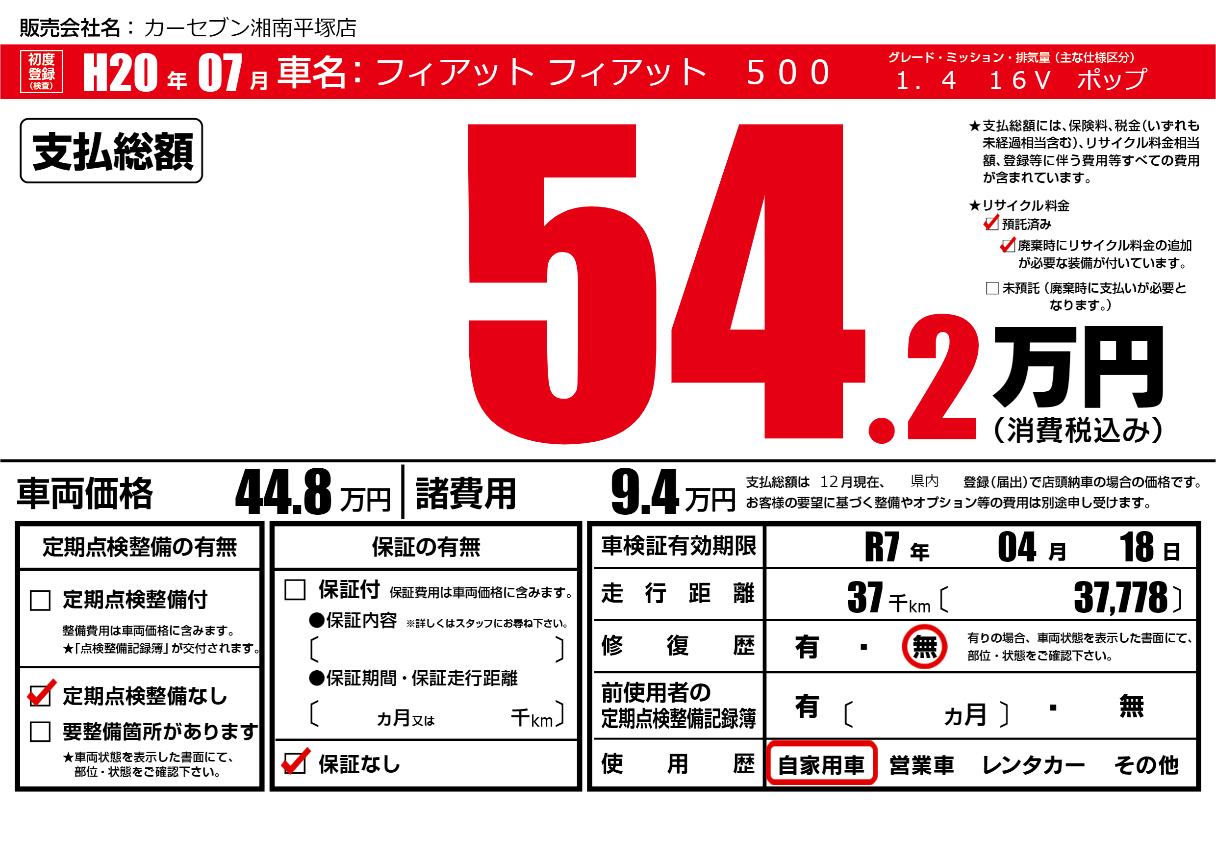 | 車名 | フィアット フィアット 500 | グレード ミッション 排気量 |