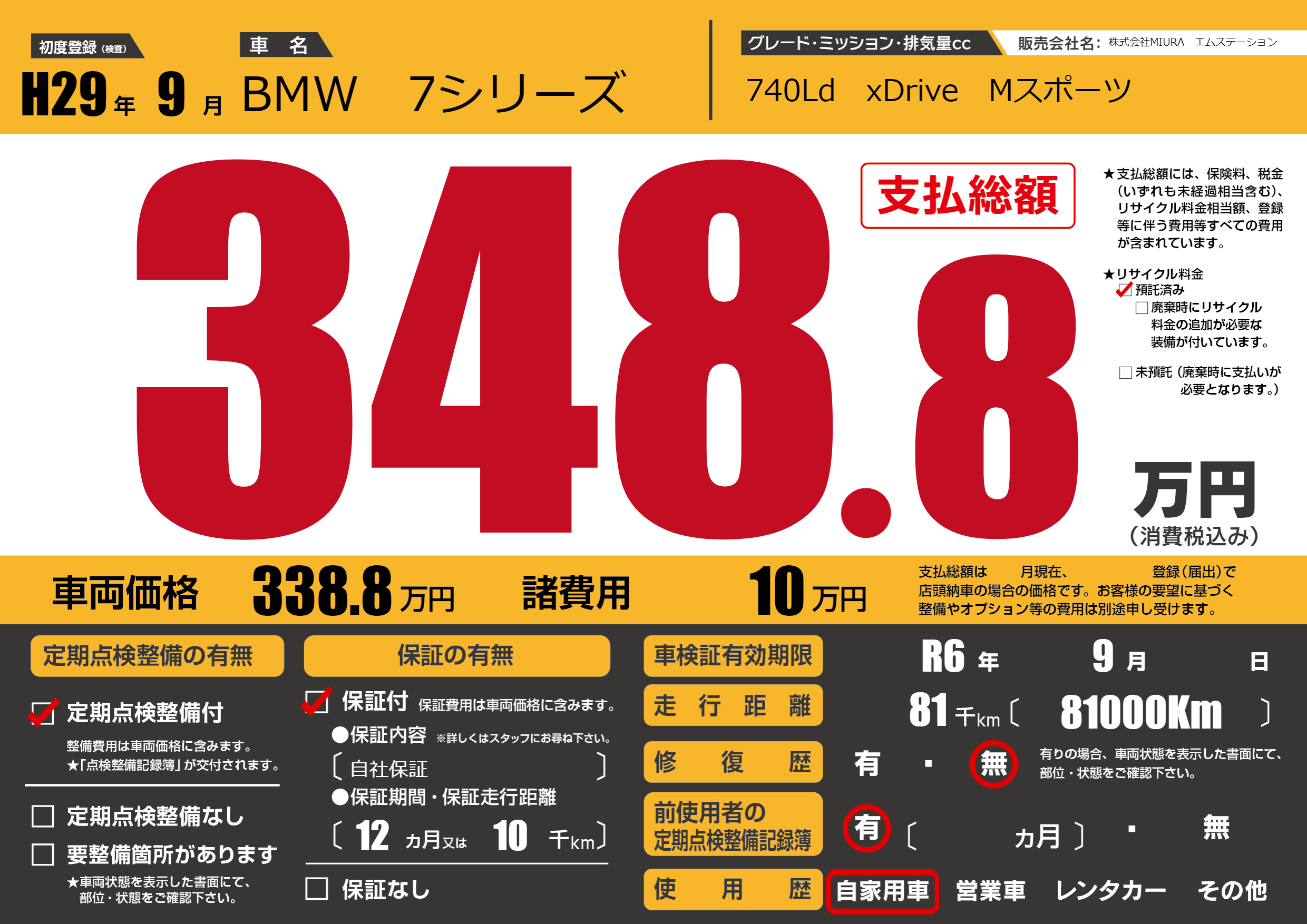 | 車名 | BMW 7シリーズ | グレード ミッション 排気量 |