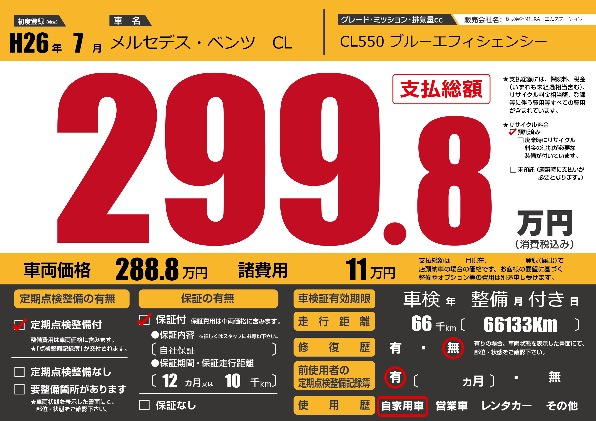 | 車名 | メルセデス・ベンツ CL | グレード ミッション 排気量 |