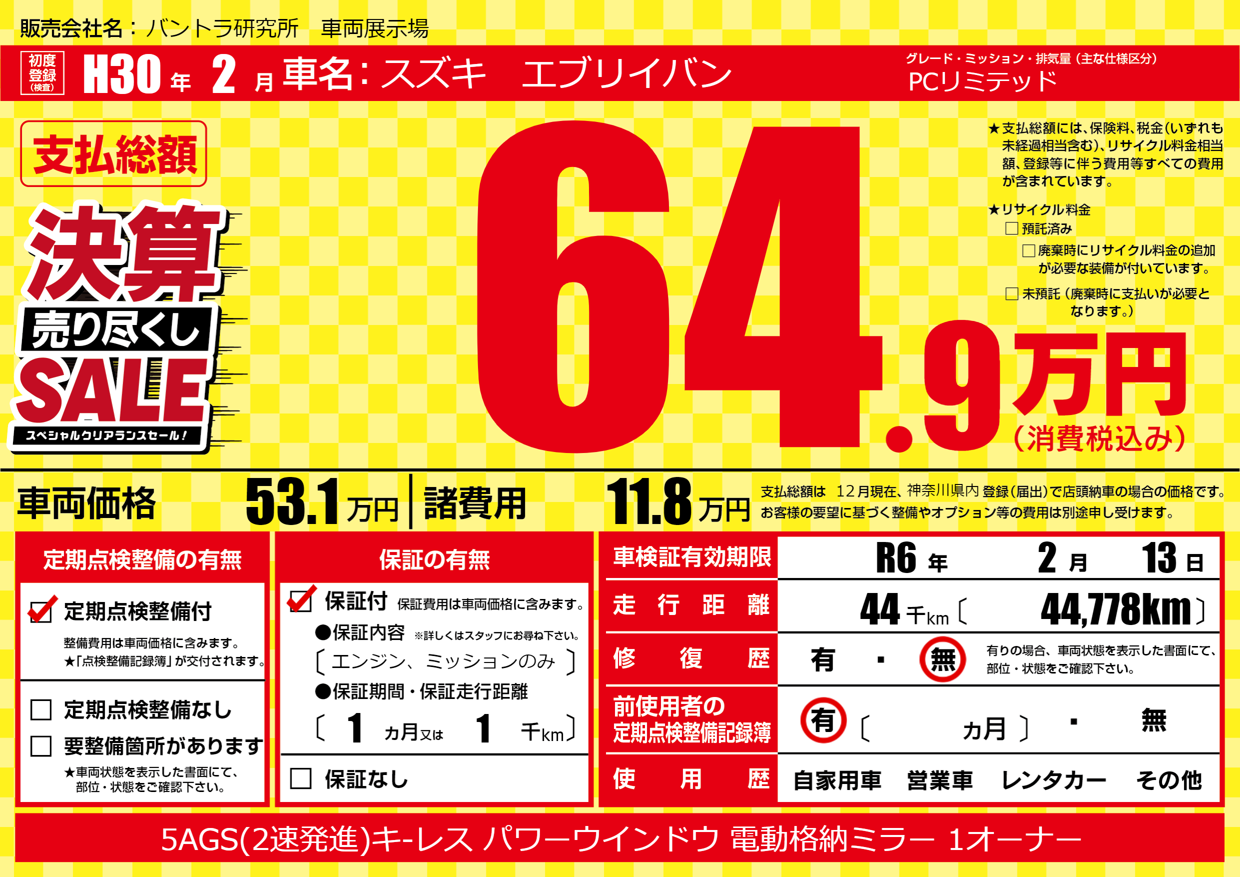 | 車名 | スズキ エブリイバン | グレード ミッション 排気量 |