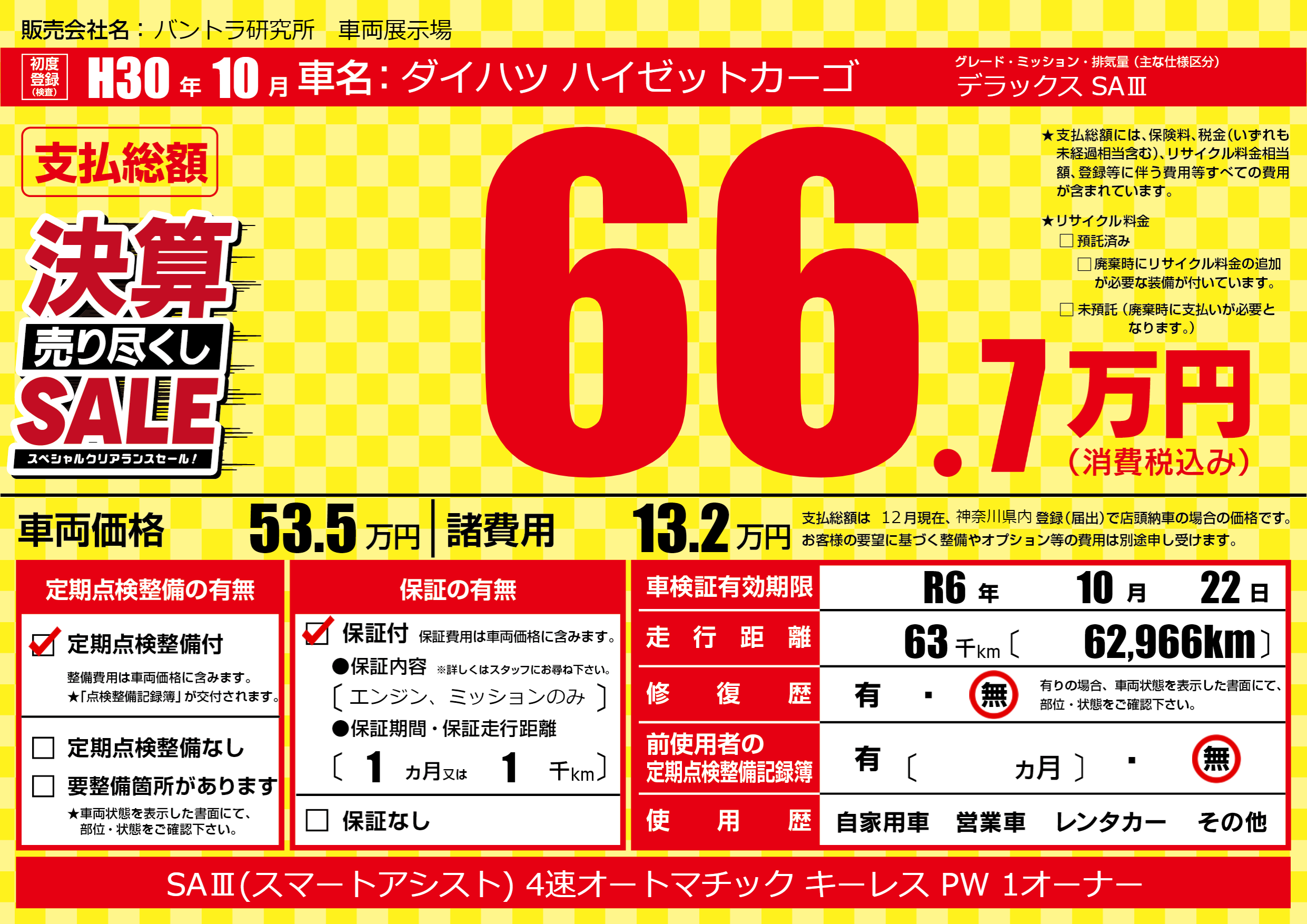 | 車名 | ダイハツ ハイゼットカーゴ | グレード ミッション 排気量 |