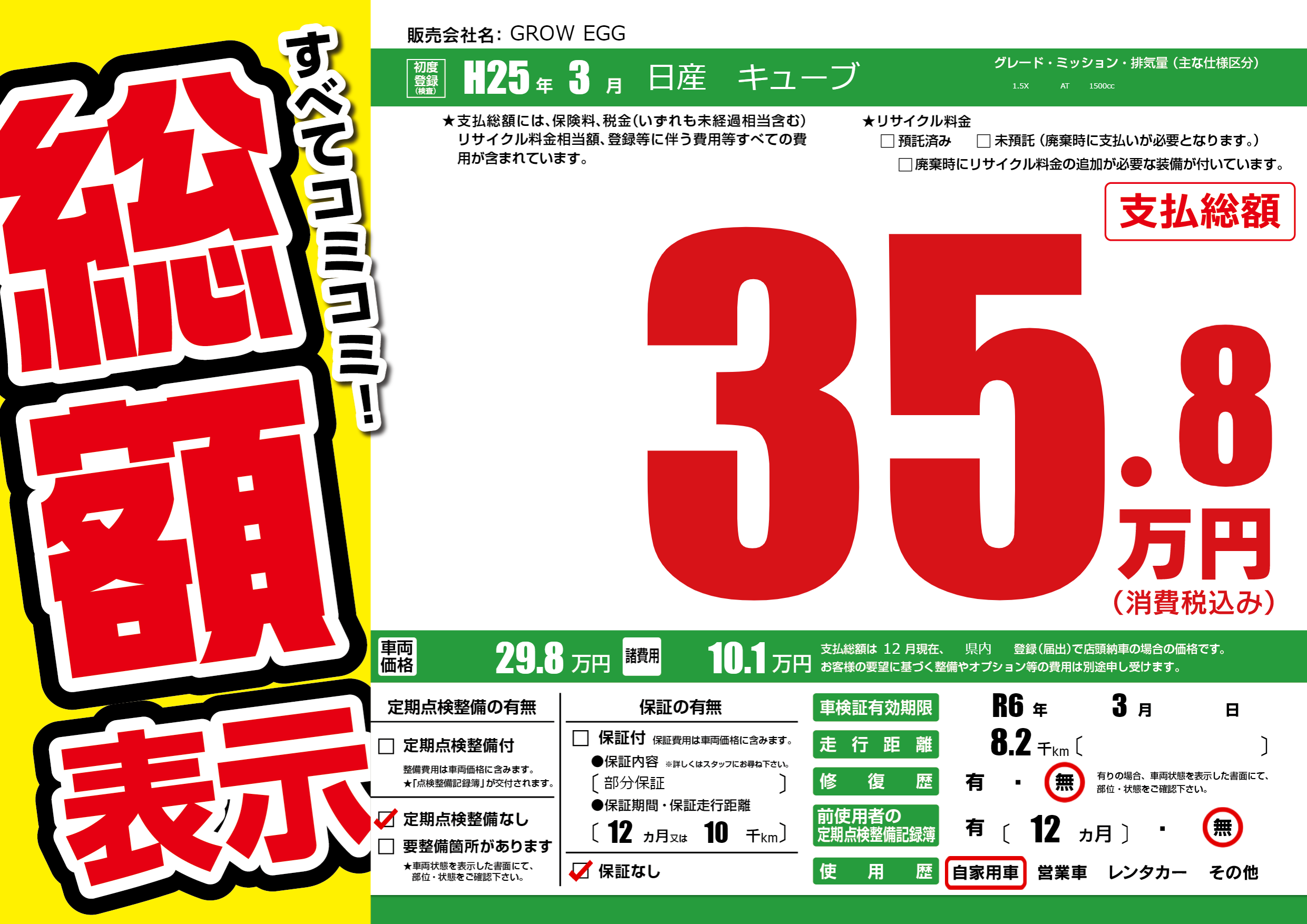 | 車名 | 日産 キューブ | グレード ミッション 排気量 |