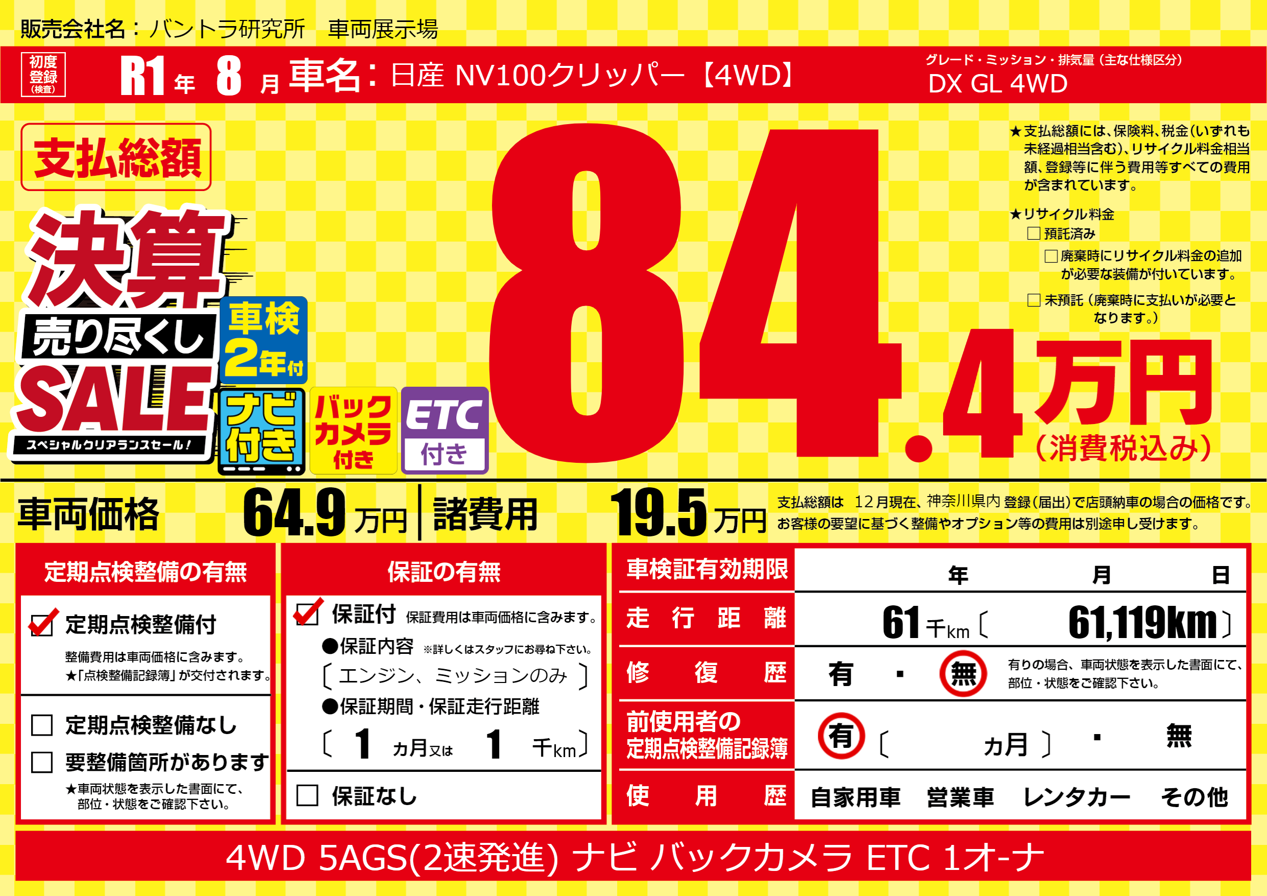 | 車名 | 日産 NV100クリッパー【4WD】 | グレード ミッション 排気量 |
