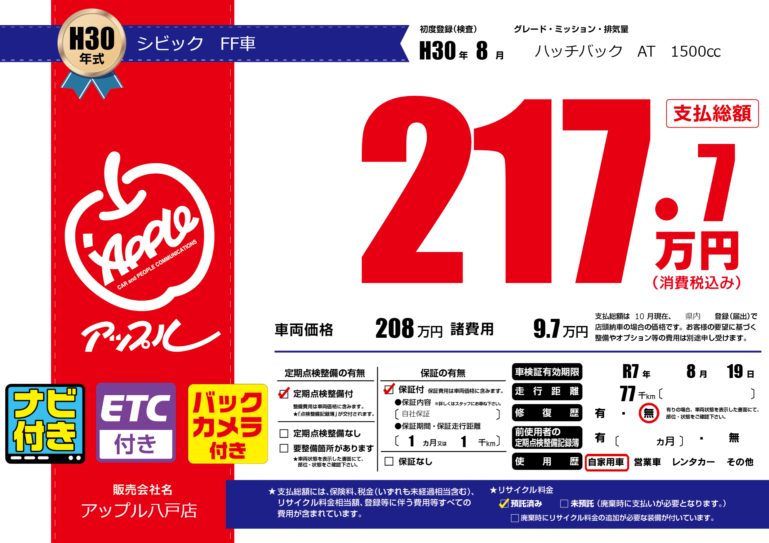 | 車検制限 | R7年 8月 19日 | ||
