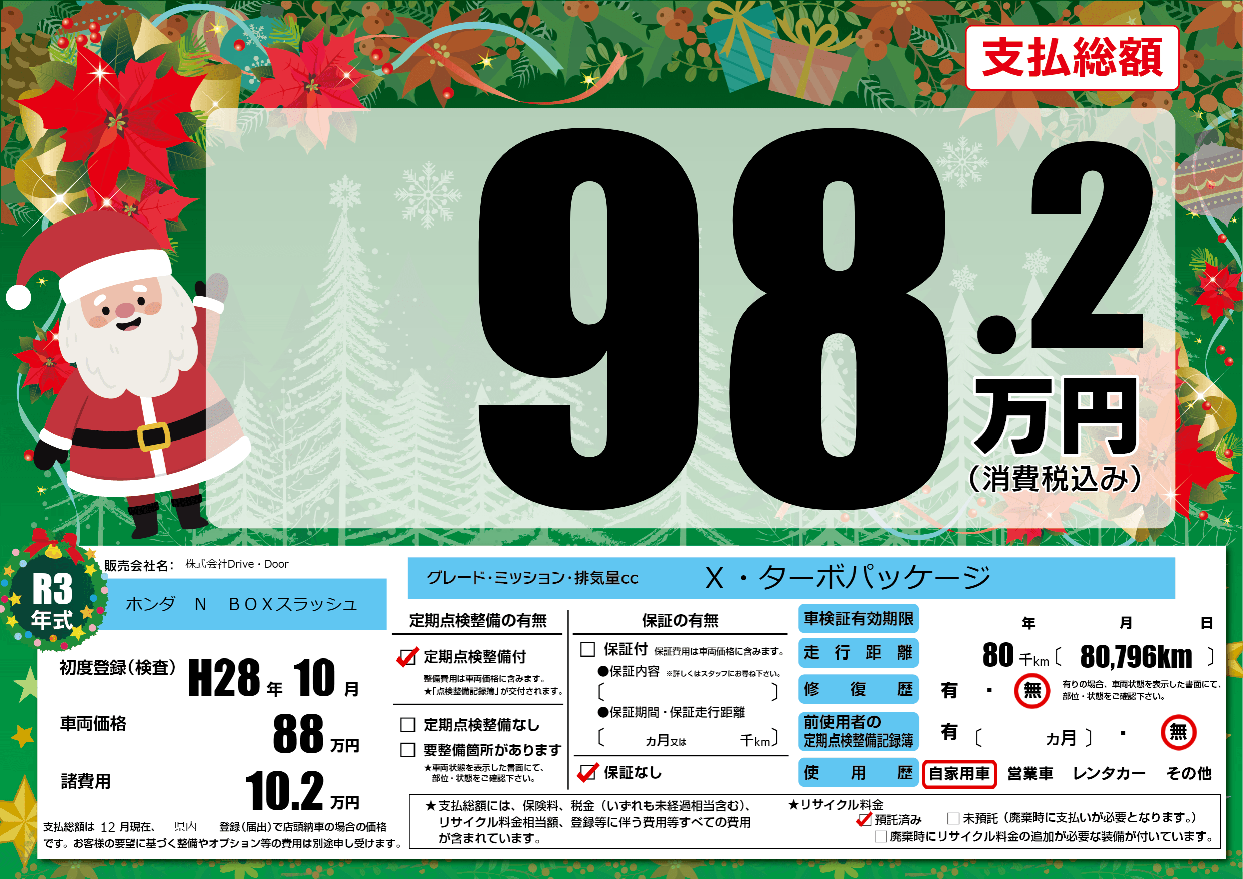 | 走行キロ | 8万km | 初年度登録 | H28年10月 |